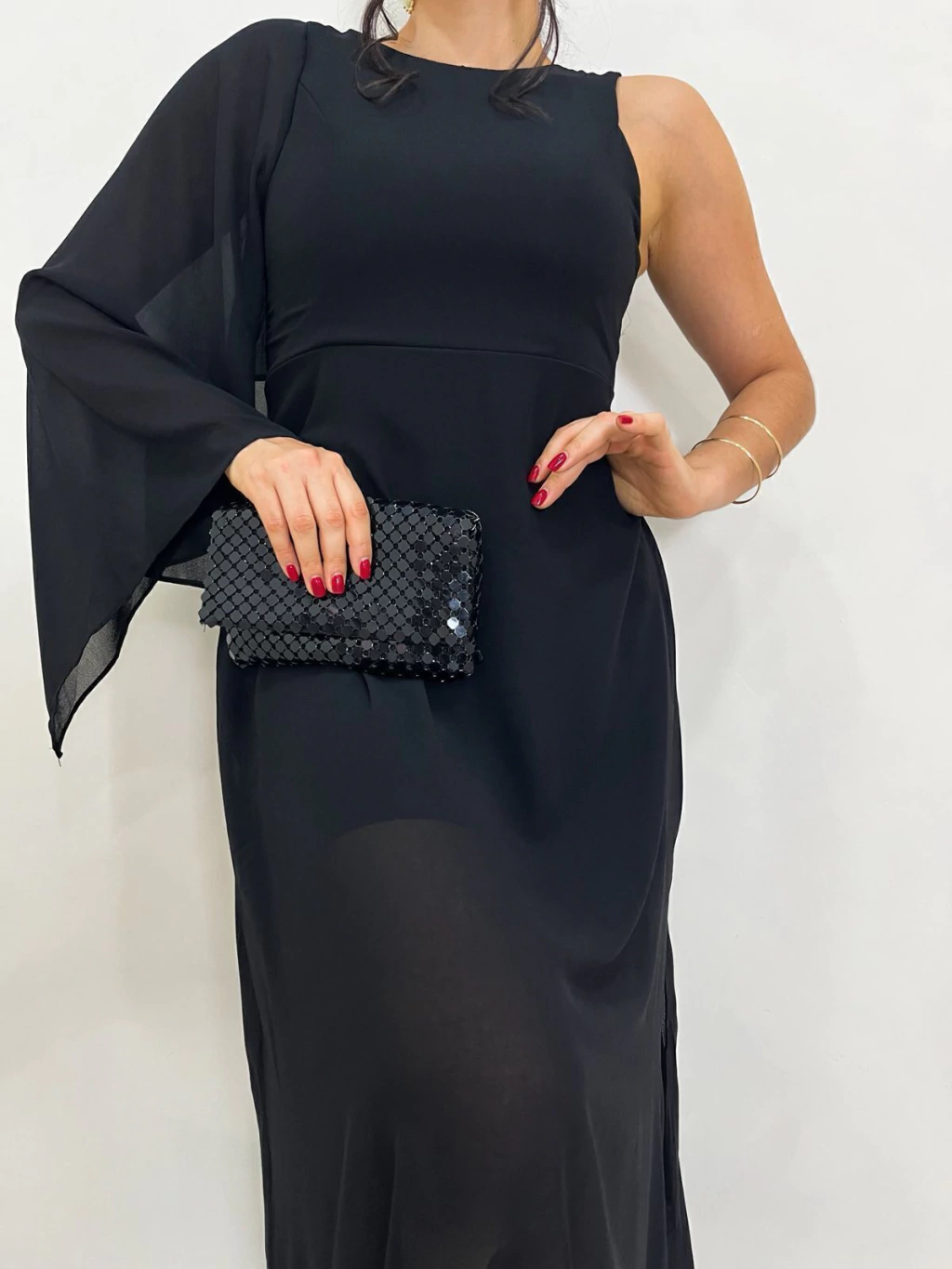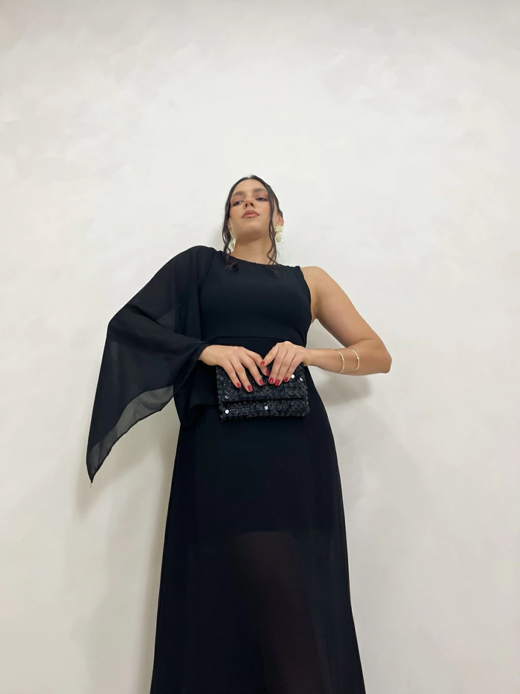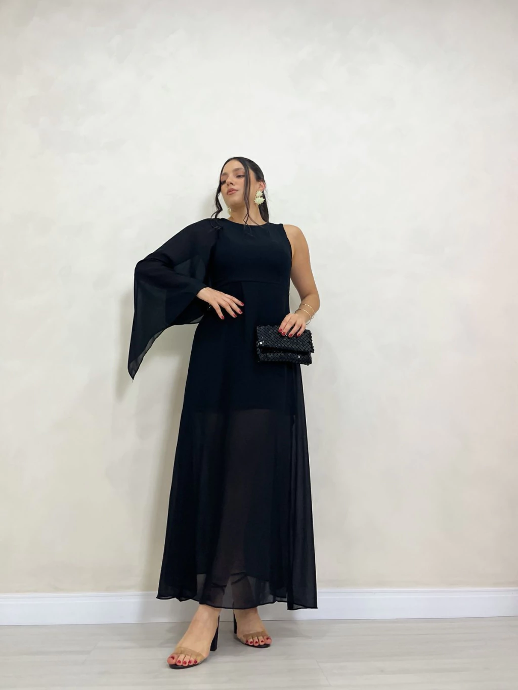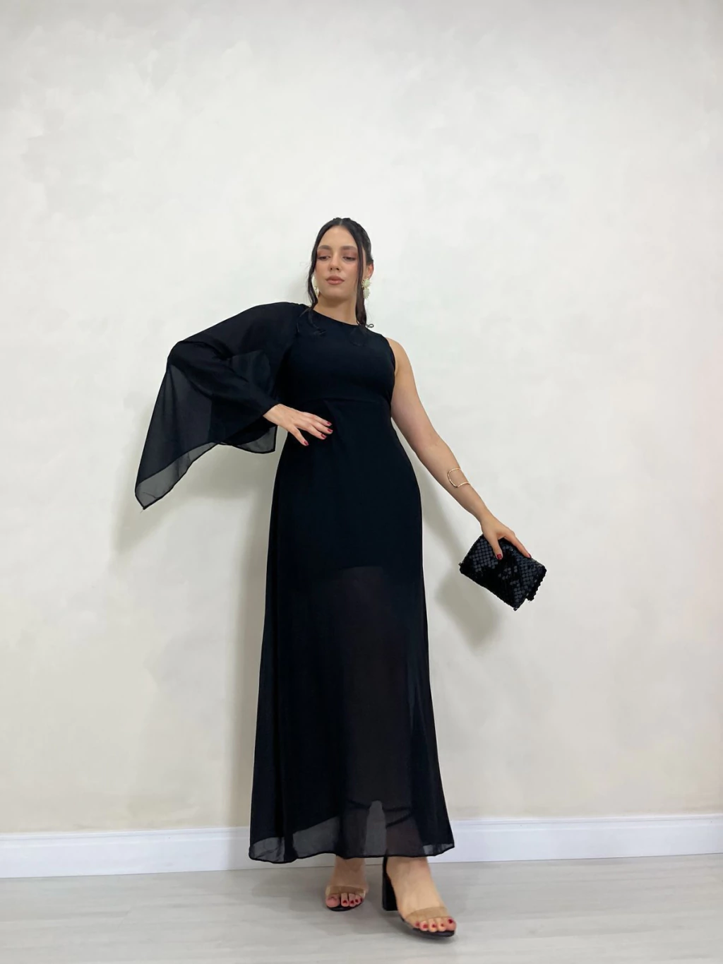 Vestido midi/longo em chiffon. Possui decote com uma manga ampla e comprimento 3/4. No outro lado, possui alça grossa. Modelo solto ao corpo, forro até metade da coxa e o restante do comprimento leve transparência. Possui fechamento atrás por zíper invisível.