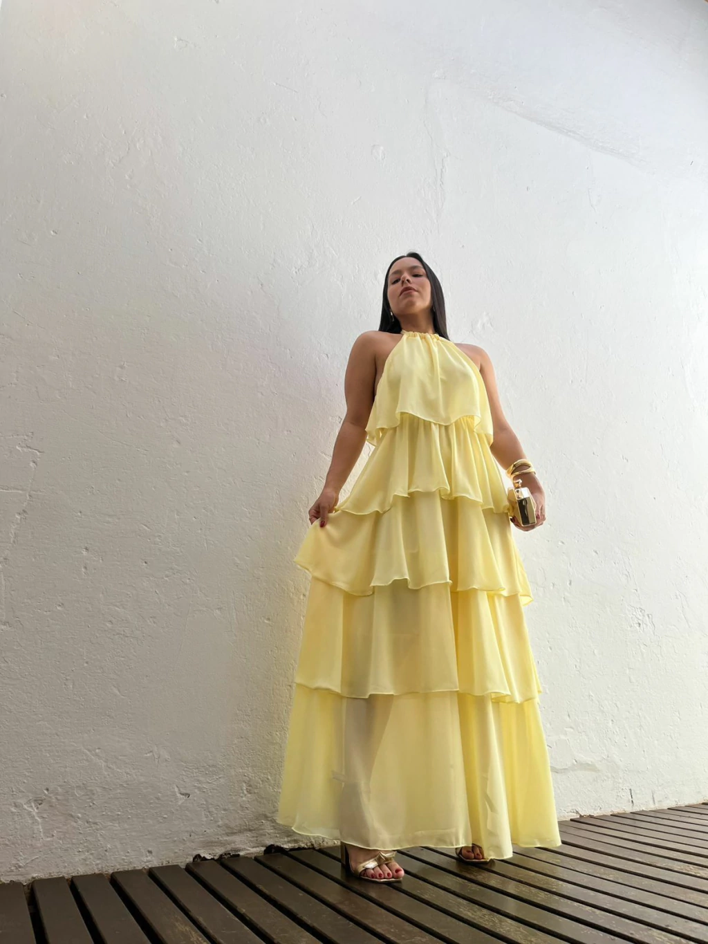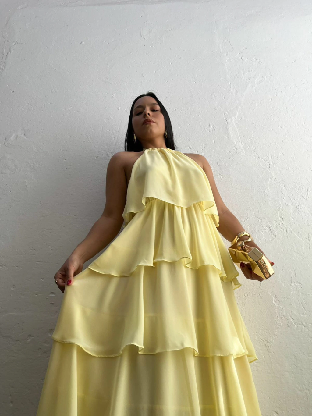 Vestido em chiffon. Possui decote frente única com amarração no pescoço. Possui modelo todo em babados com camadas. Soltinho no corpo, ele possui forro. Não marca e não fica transparente.