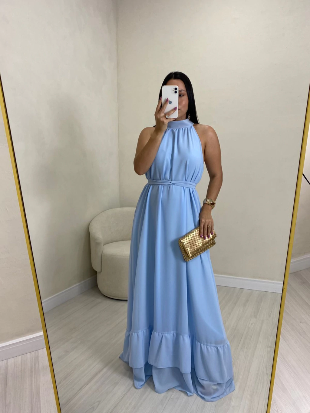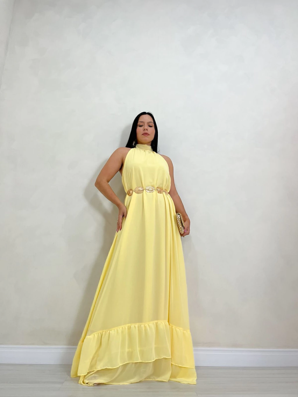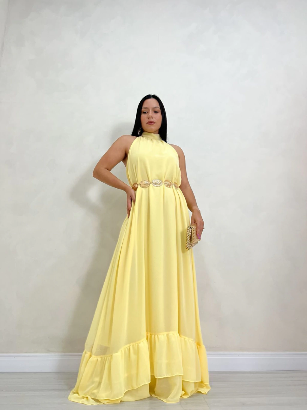 Vestido longo em chiffon. Possui fechado com gola alta e amarração no pescoço. Modelo sem mangas. Possui caimento solto ao corpo, com detalhe de babados na barra e acompanha faixa para acinturar a peça. Tecido fluido, com forro. Não marca e não fica transparente.
