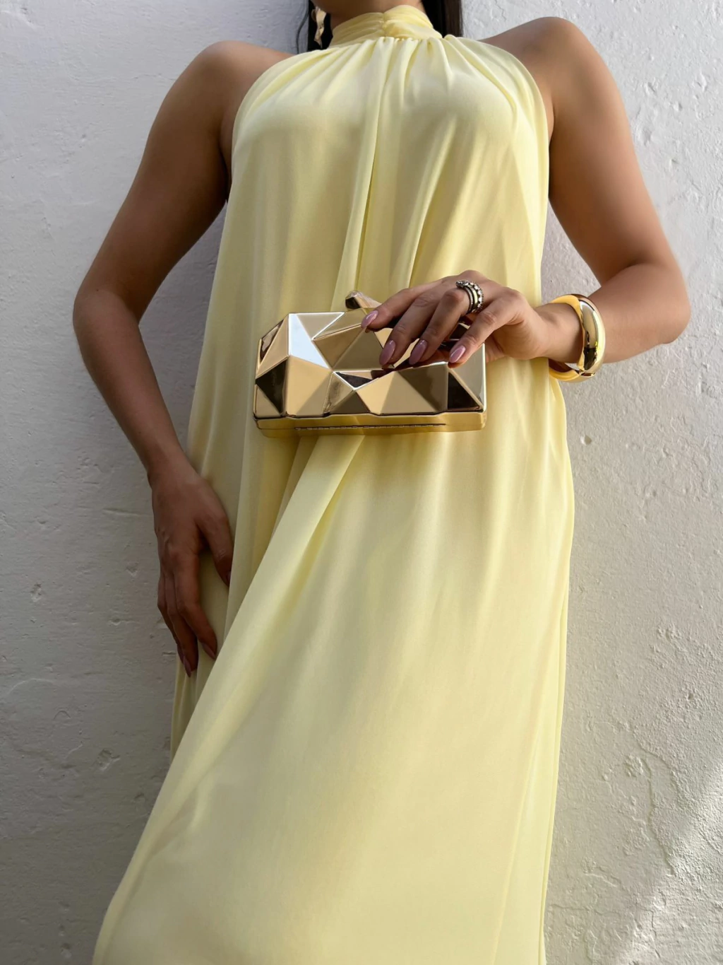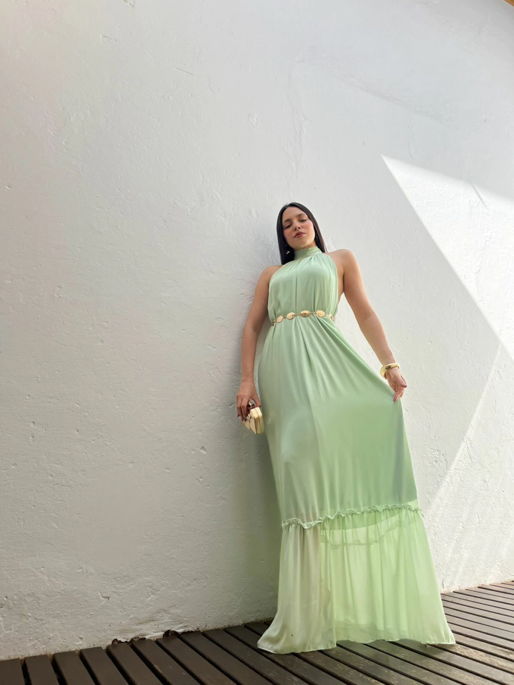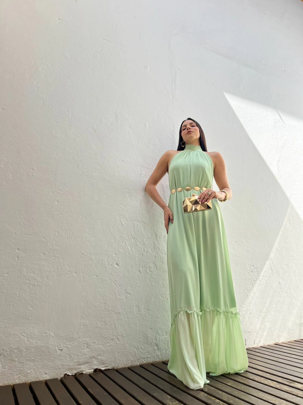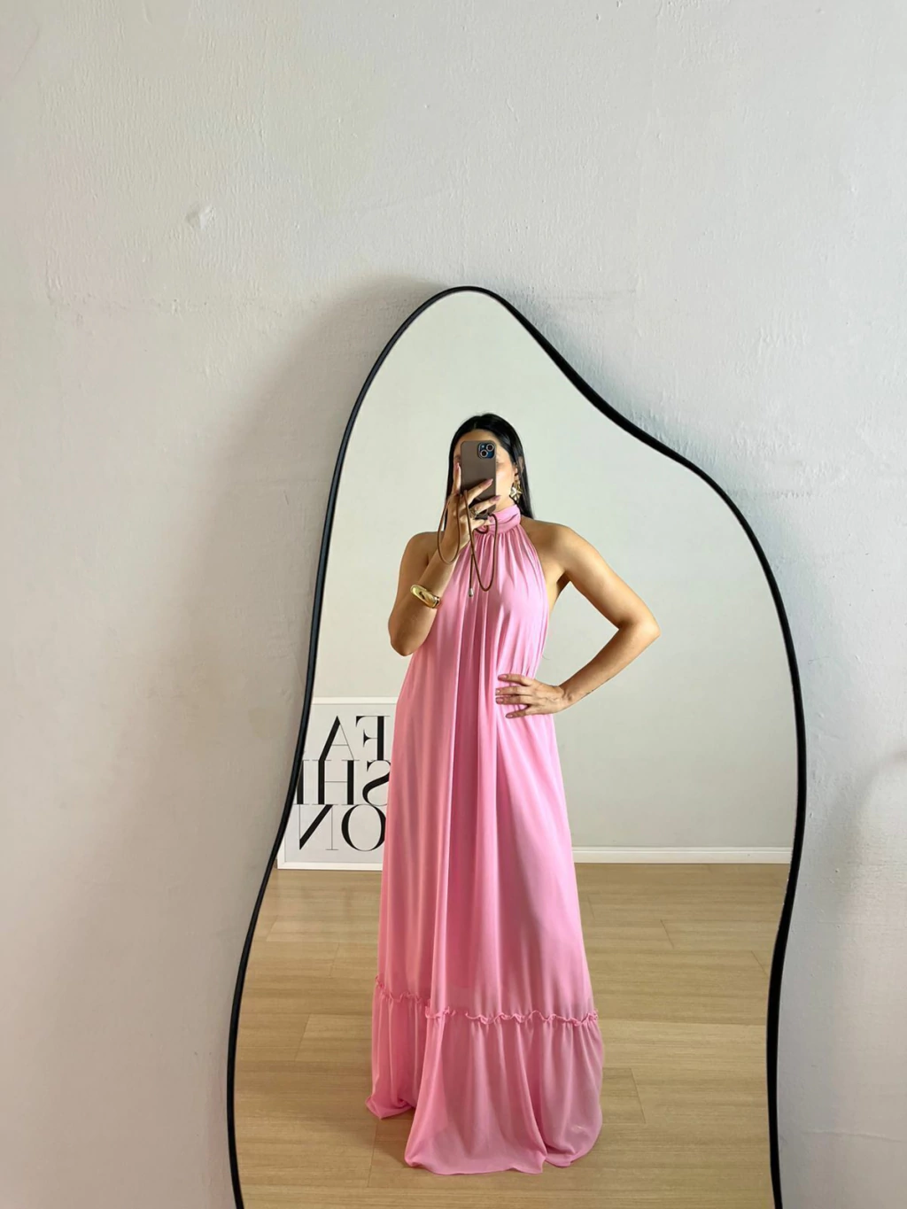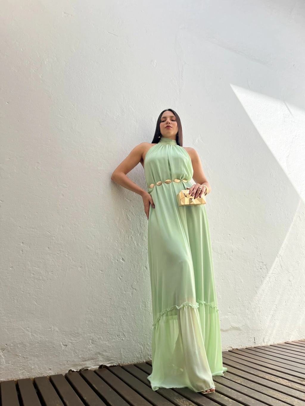 Vestido longo em chiffon. Possui modelagem solta ao corpo. Possui decote frente única com amarração no pescoço. Possui gola mais alta com detalhe drapeado. Possui costas abertas. Não marca e não fica transparente.