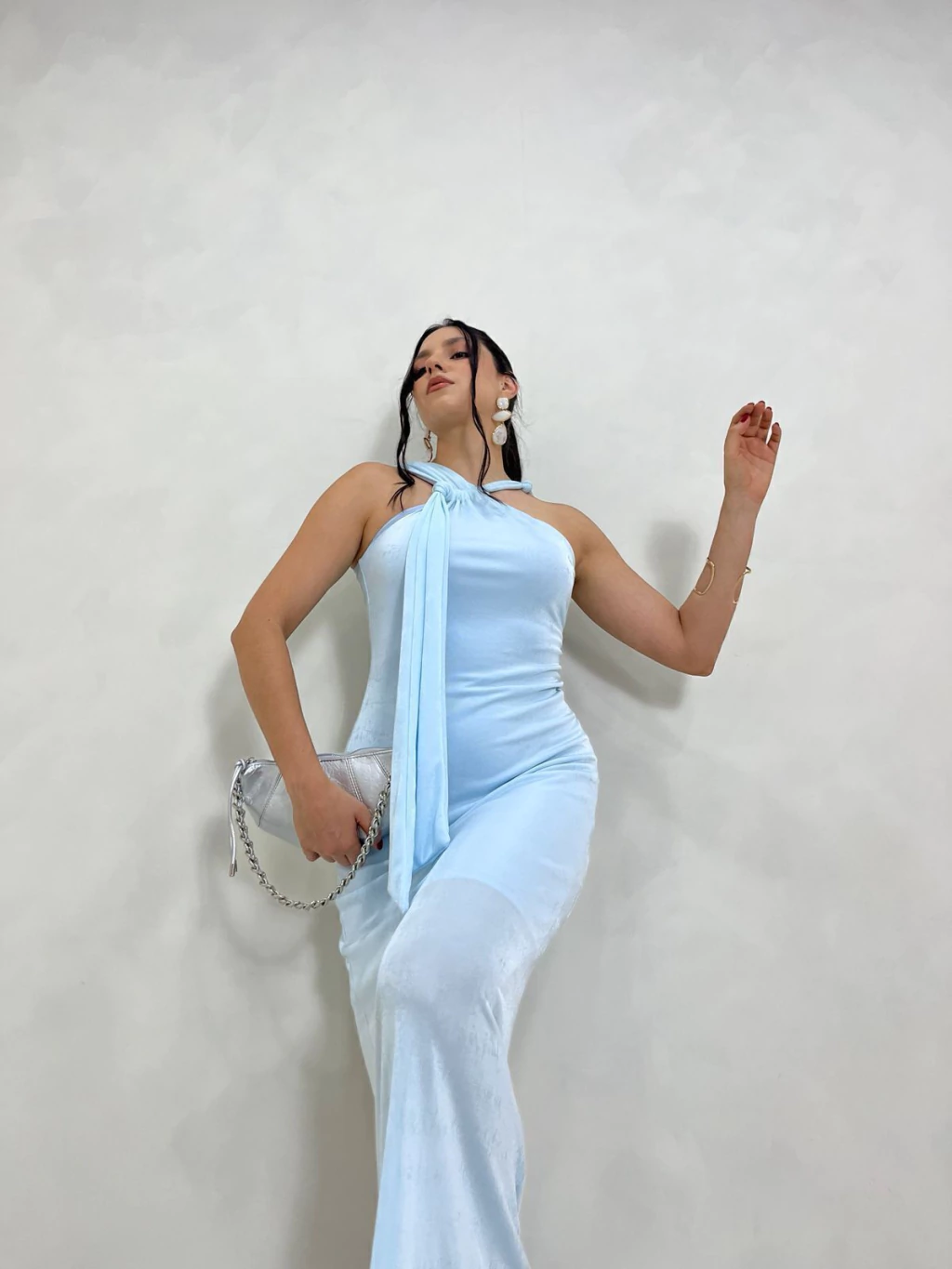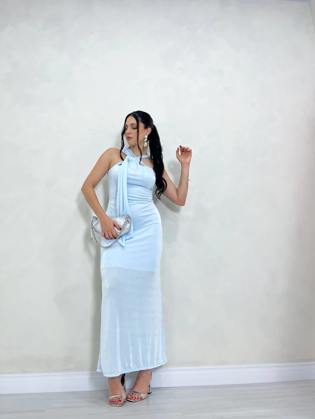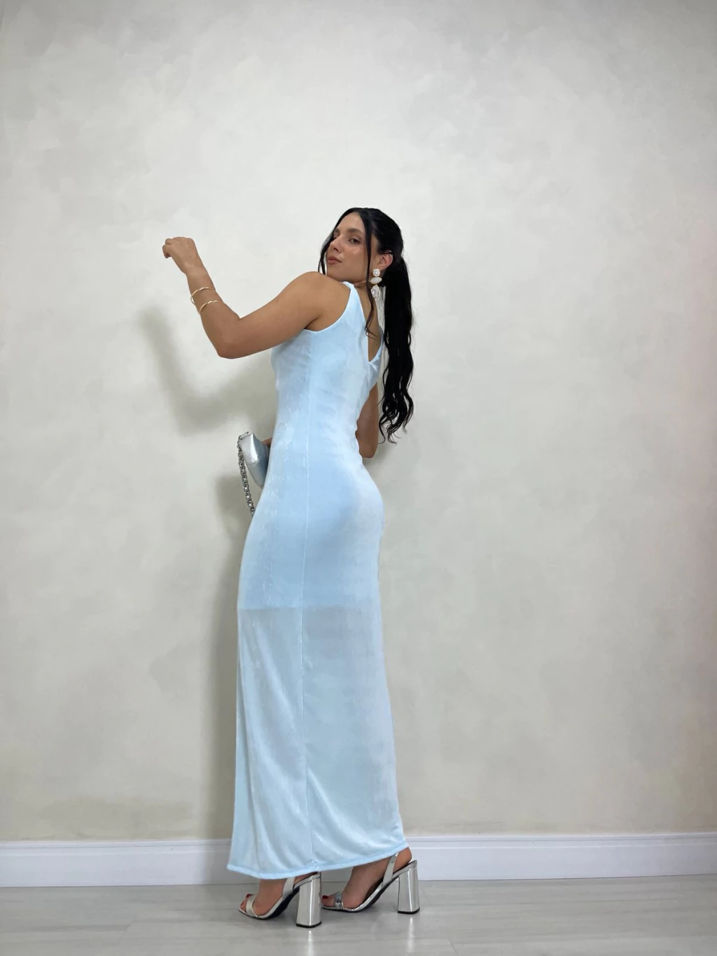 Vestido midi em tecido com textura canelada, mais acetinado. Possui alças assimétricas e ajustáveis de um lado. Possui decote V na frente e atrás. Modelagem ajustada ao corpo. Possui forro no comprimento do vestido.