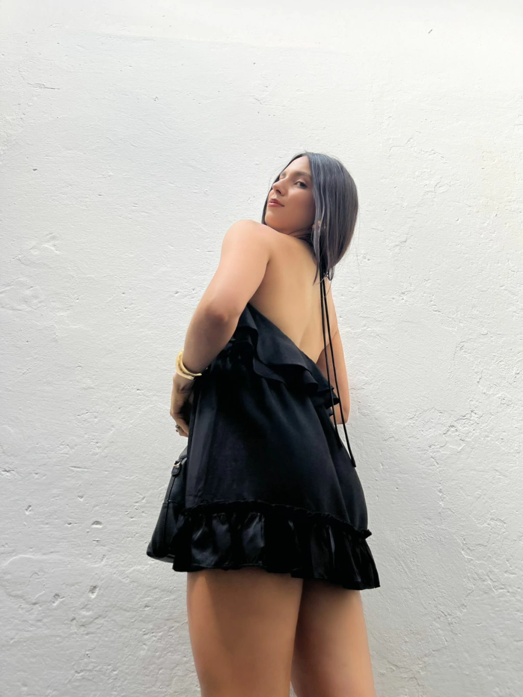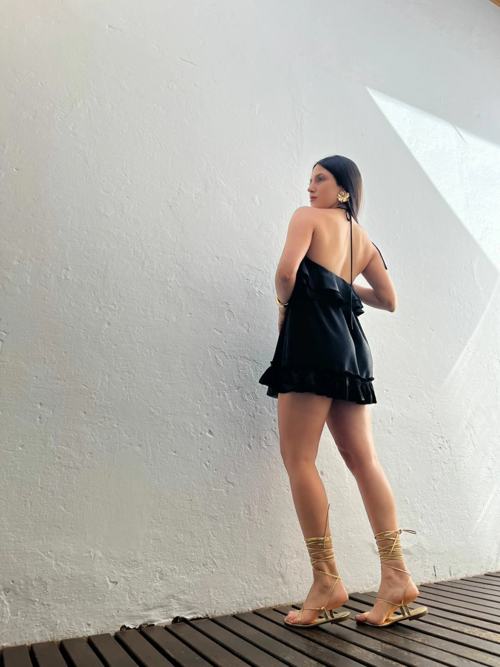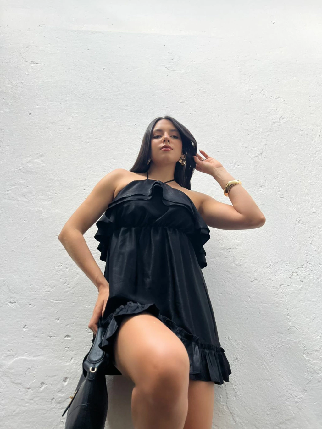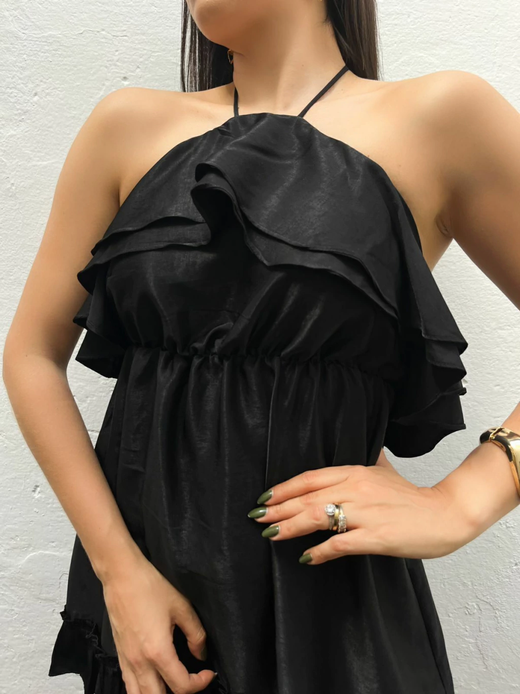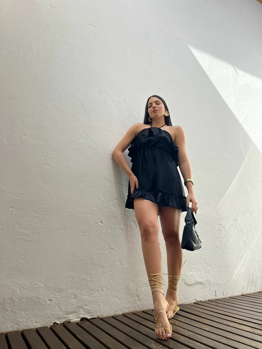 Vestido curto preto em tecido acetinado. Possui decote frente única, com amarração no pescoço. Possui babados na parte superior do decote. Possui elástico marcando a cintura e babados na barra. Modelagem solta ao corpo. Não marca e não fica transparente.