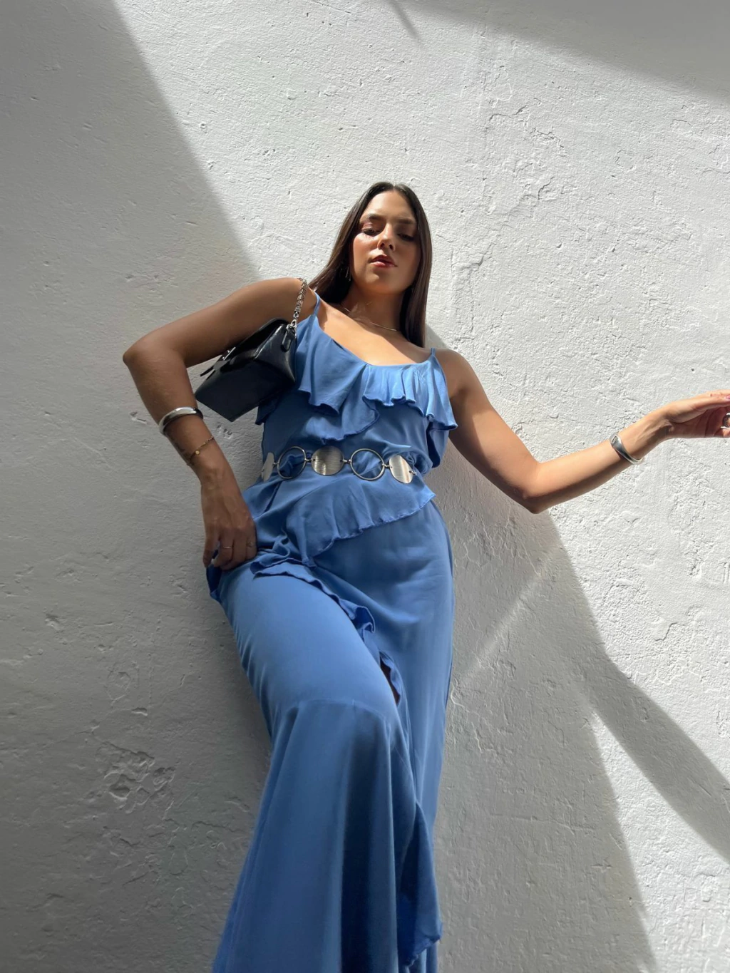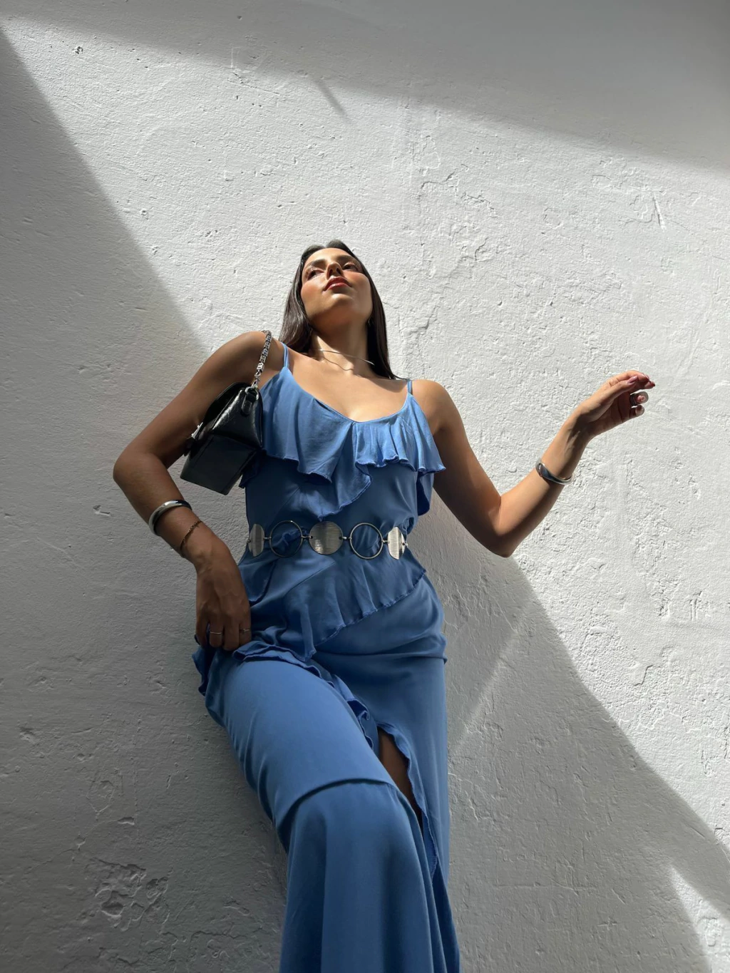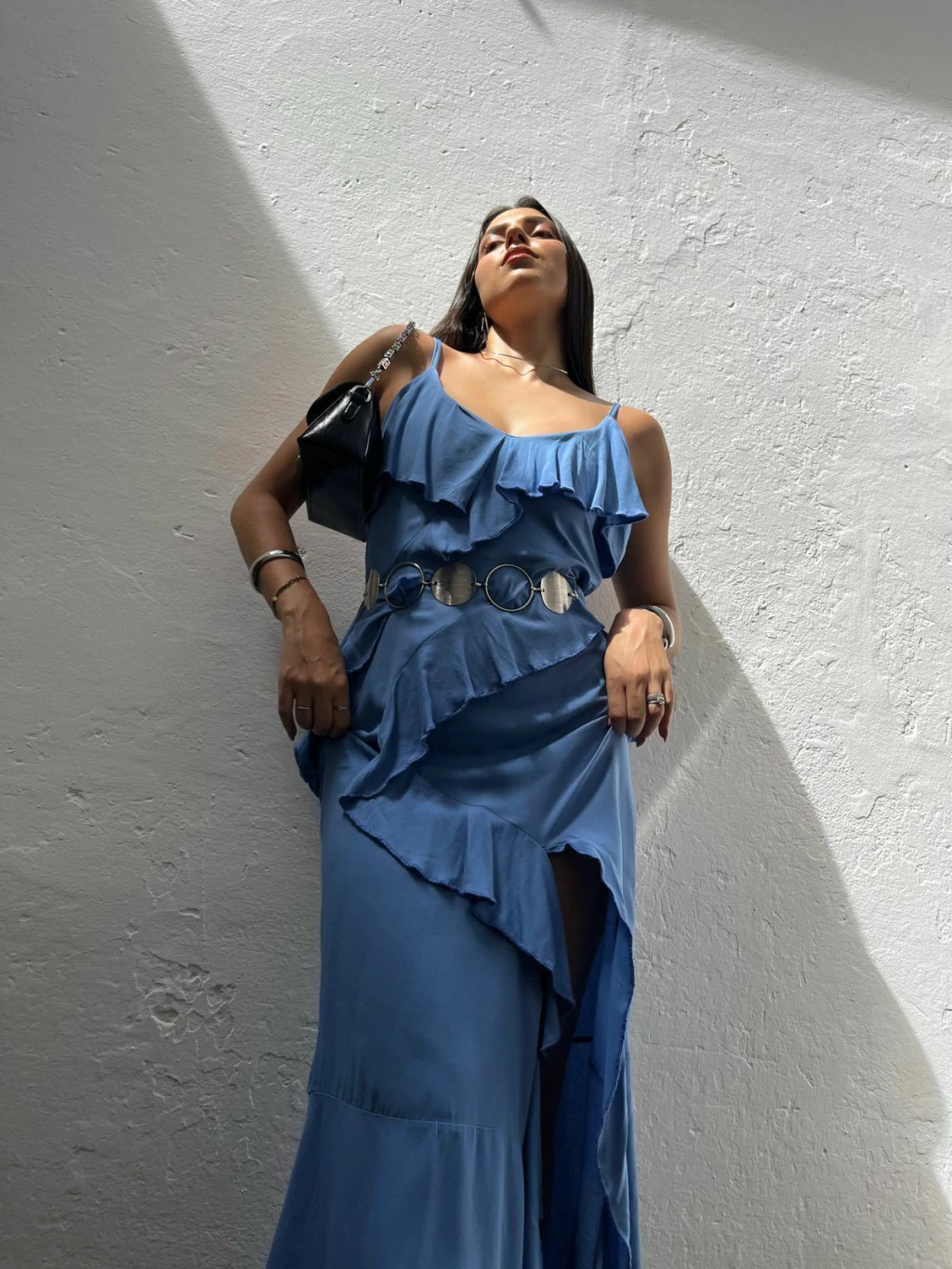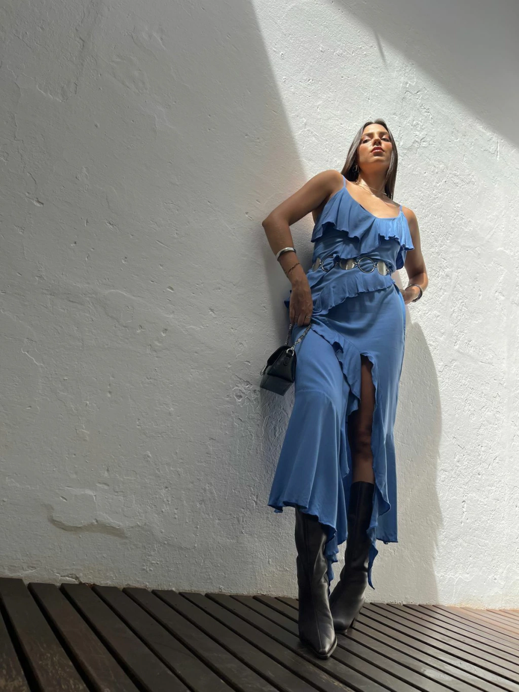 Vestido em viscose com sarja. Possui comprimento midi, alças finas com regulagem e babados por toda extensão da peça. Modelo solto ao corpo, estilo boho que está super em alta. Possui assimetria na frente. Não marca e não fica transparente.