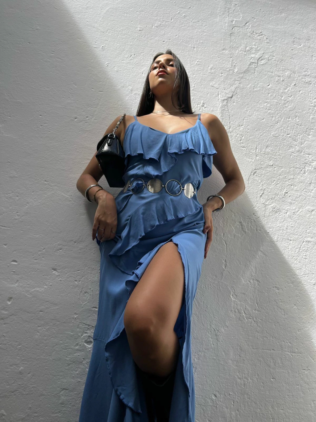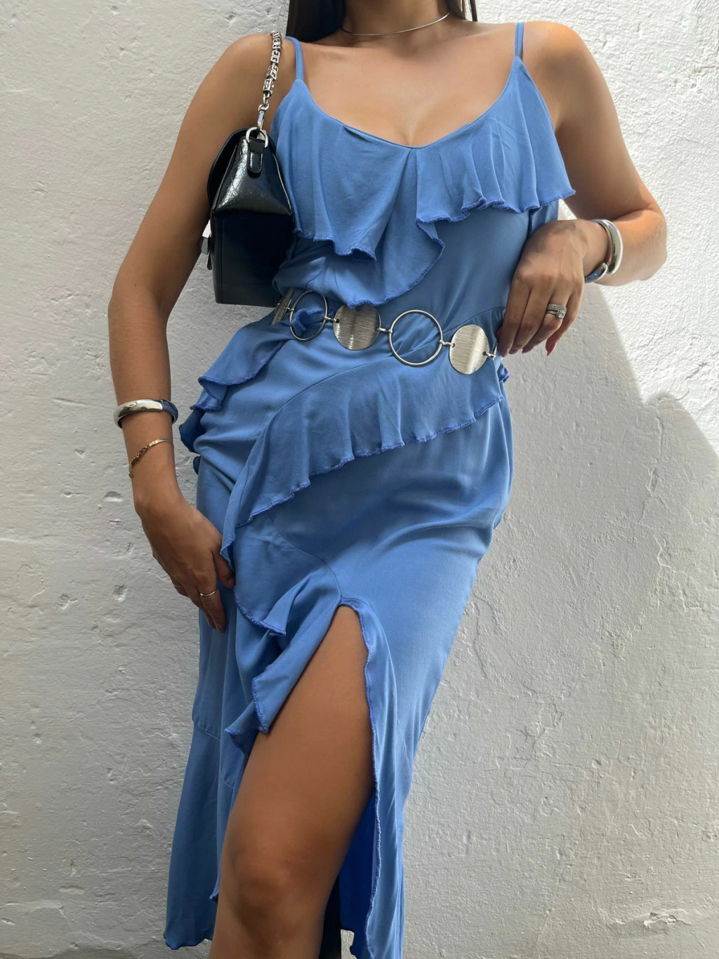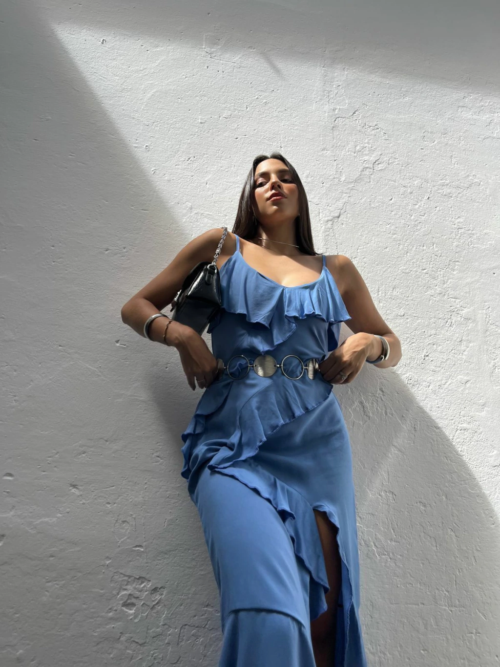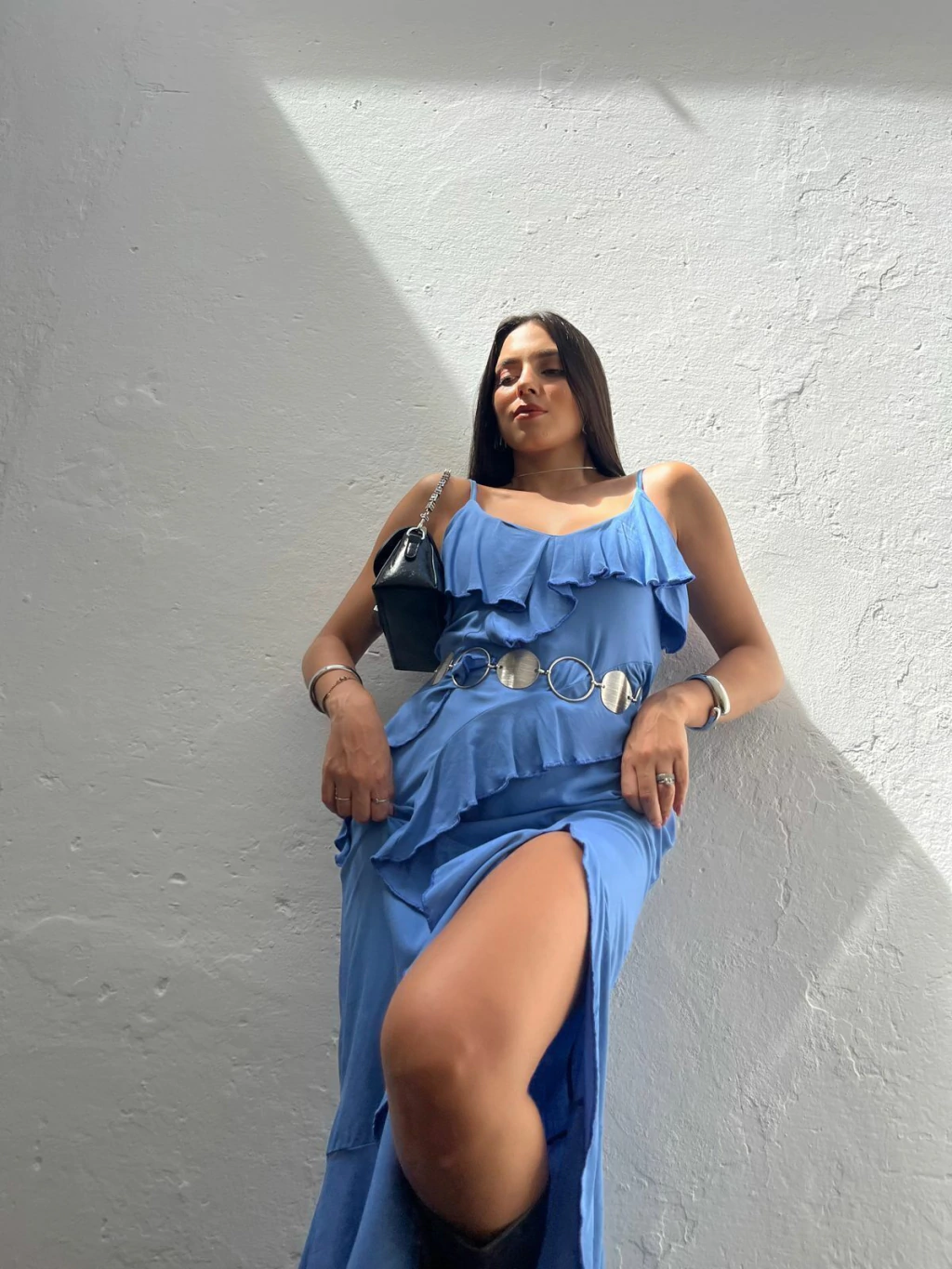 Vestido em viscose com sarja. Possui comprimento midi, alças finas com regulagem e babados por toda extensão da peça. Modelo solto ao corpo, estilo boho que está super em alta. Possui assimetria na frente. Não marca e não fica transparente.