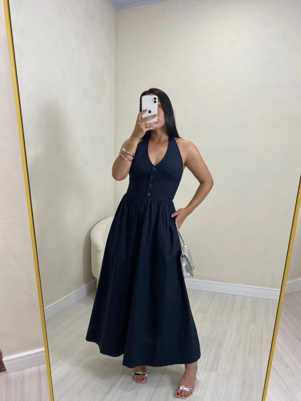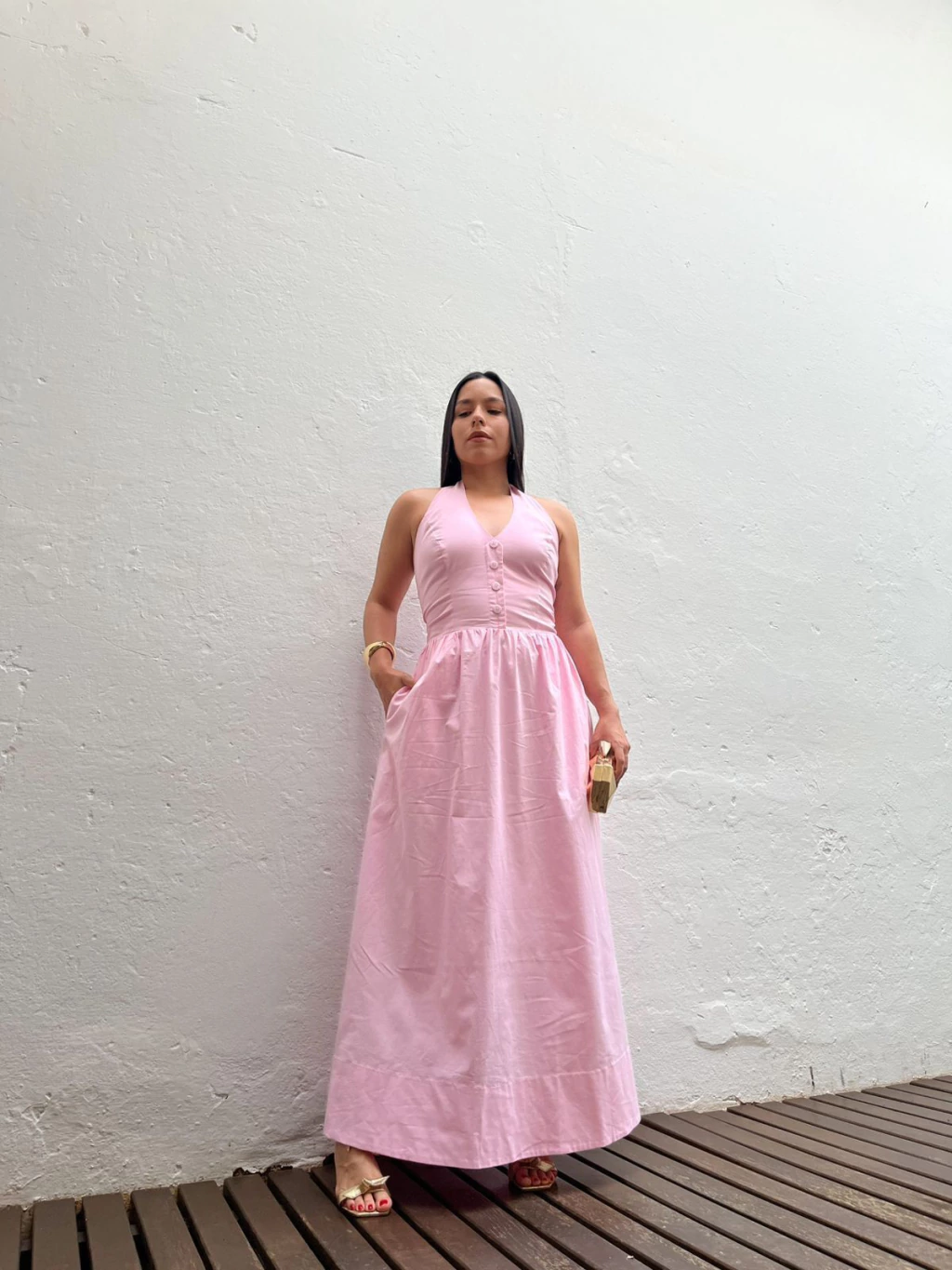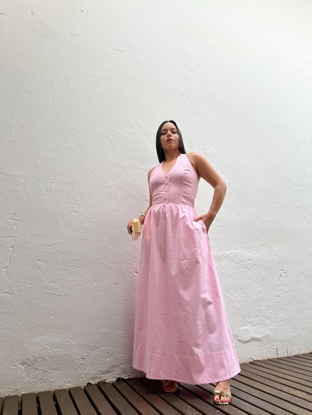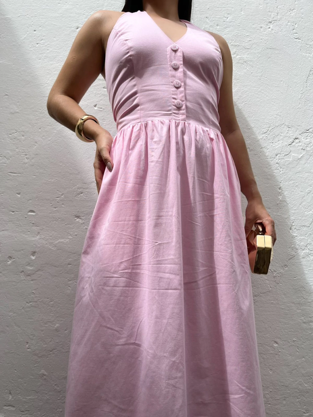 Vestido midi em tricoline. Possui decote frente única, com fechamento por botões no pescoço. Possui decote V e botões frontais não funcionais. Possui modelo mais ajustado até a cintura e solto na saia. A saia possui modelo mais princesa, com bolsos latetais e forro. Não marca e não fica transparente.