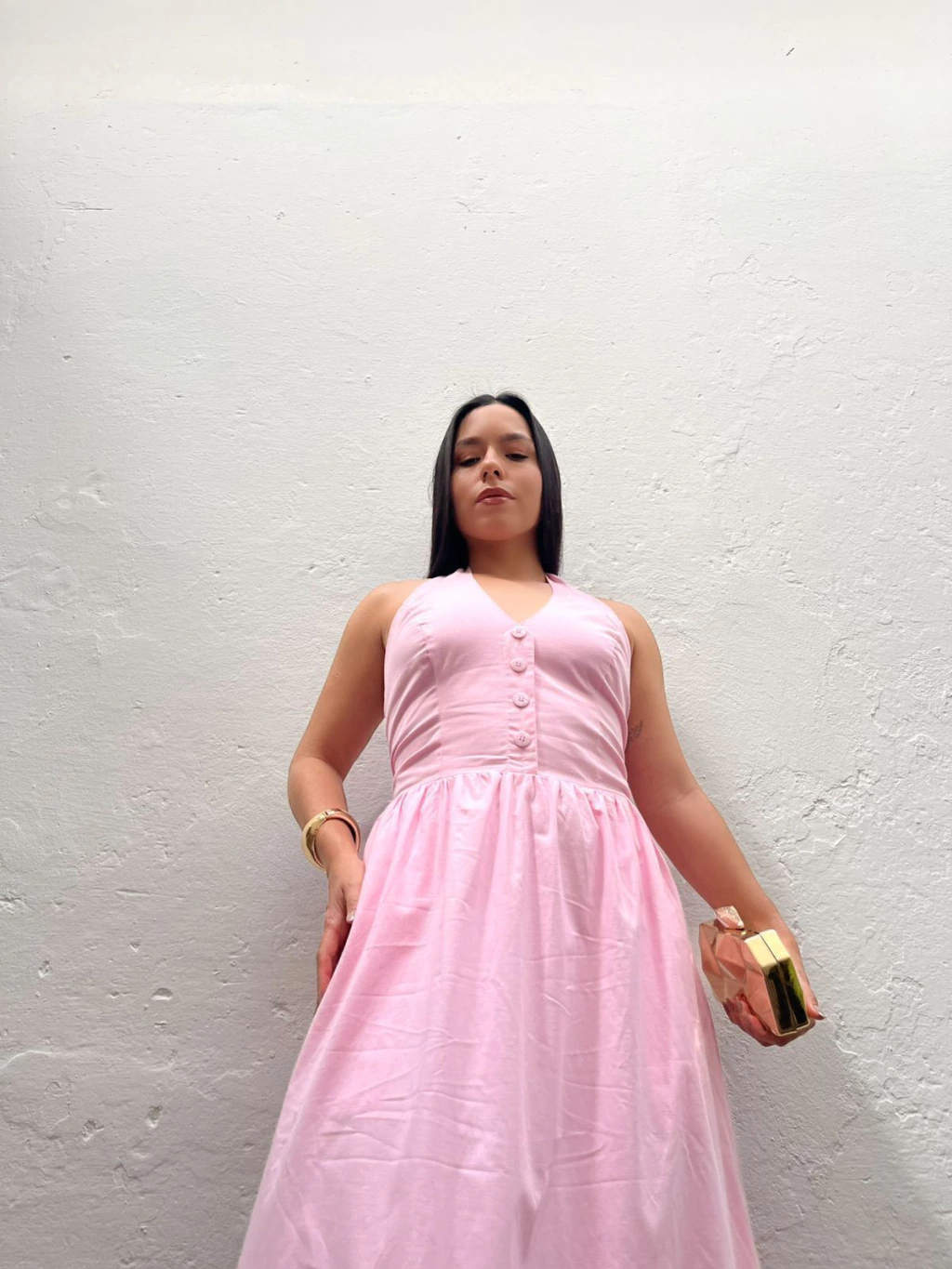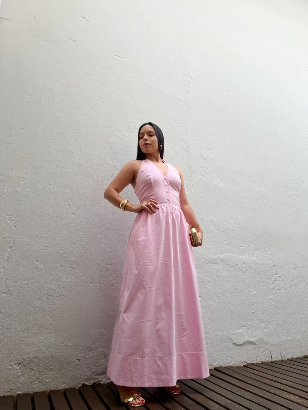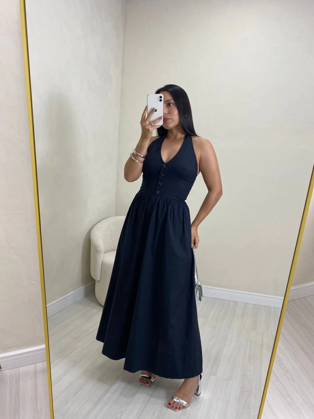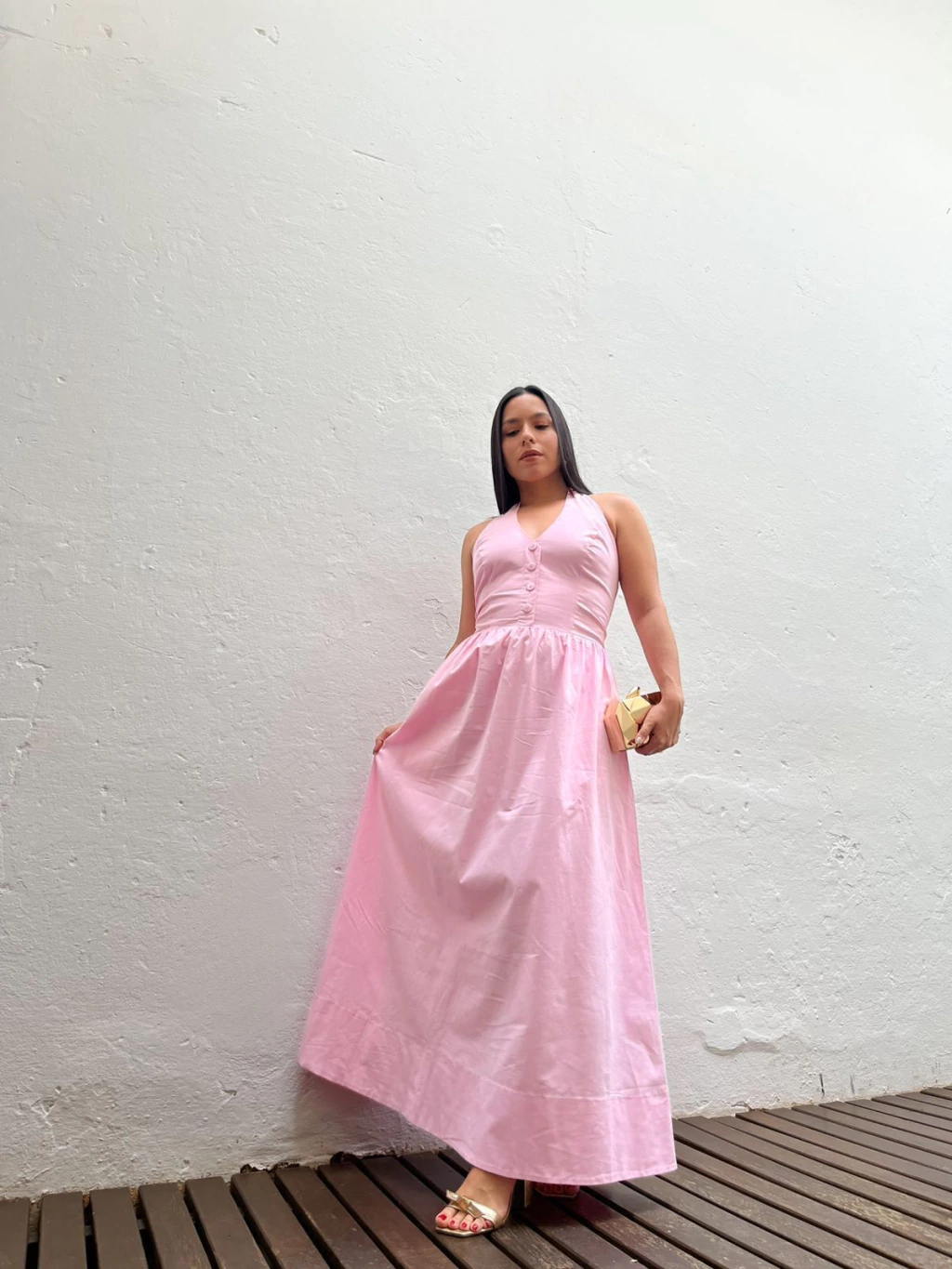Vestido midi em tricoline. Possui decote frente única, com fechamento por botões no pescoço. Possui decote V e botões frontais não funcionais. Possui modelo mais ajustado até a cintura e solto na saia. A saia possui modelo mais princesa, com bolsos latetais e forro. Não marca e não fica transparente.
