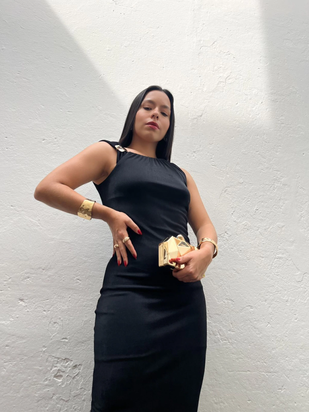 Vestido midi em tecido acetinado. Possui modelagem ajustada ao corpo, fenda lateral e forro. Possui detalhe em uma das alças com fivela dourada. O tecido possui elastano. Não marca e não fica transparente.