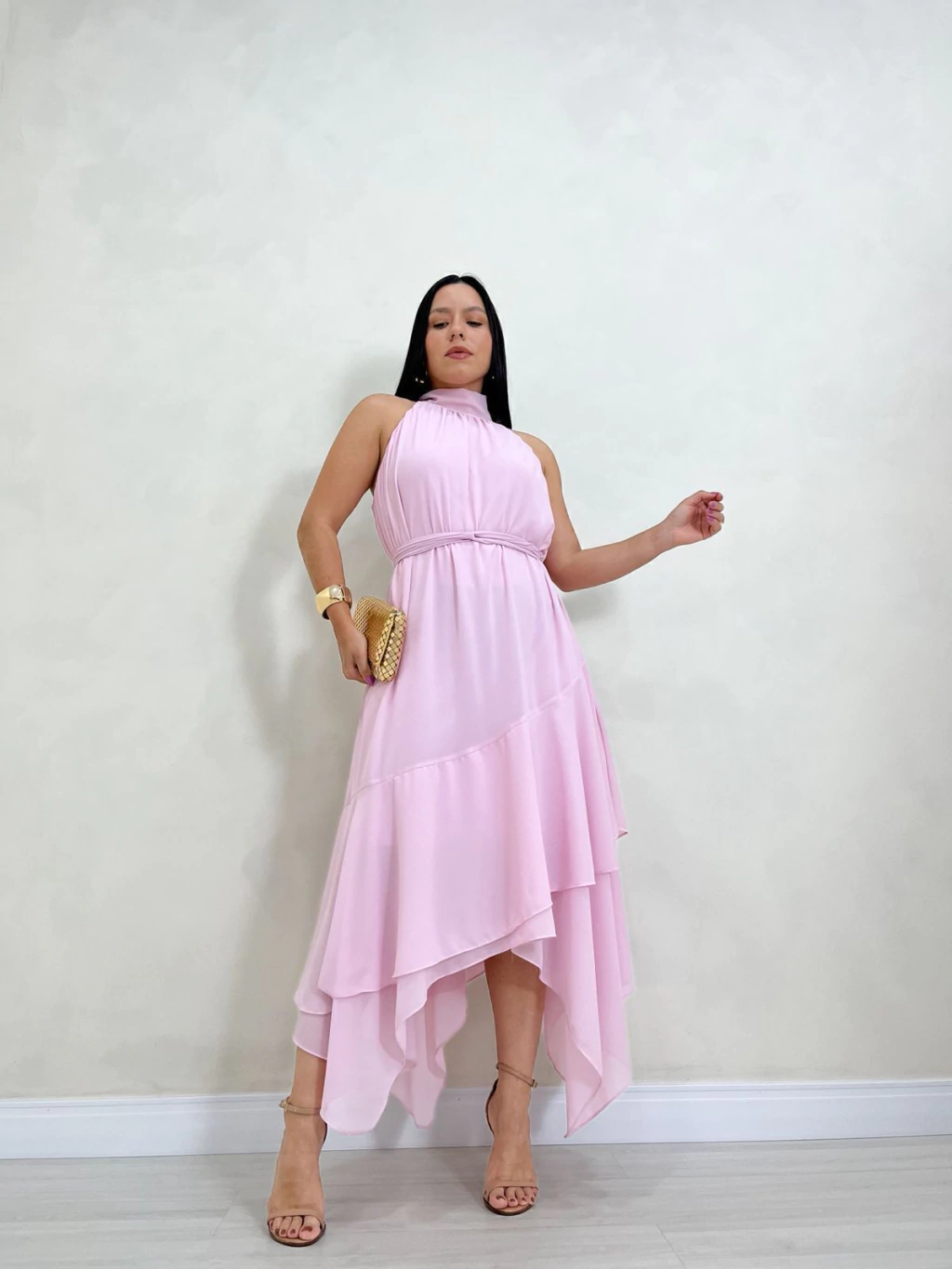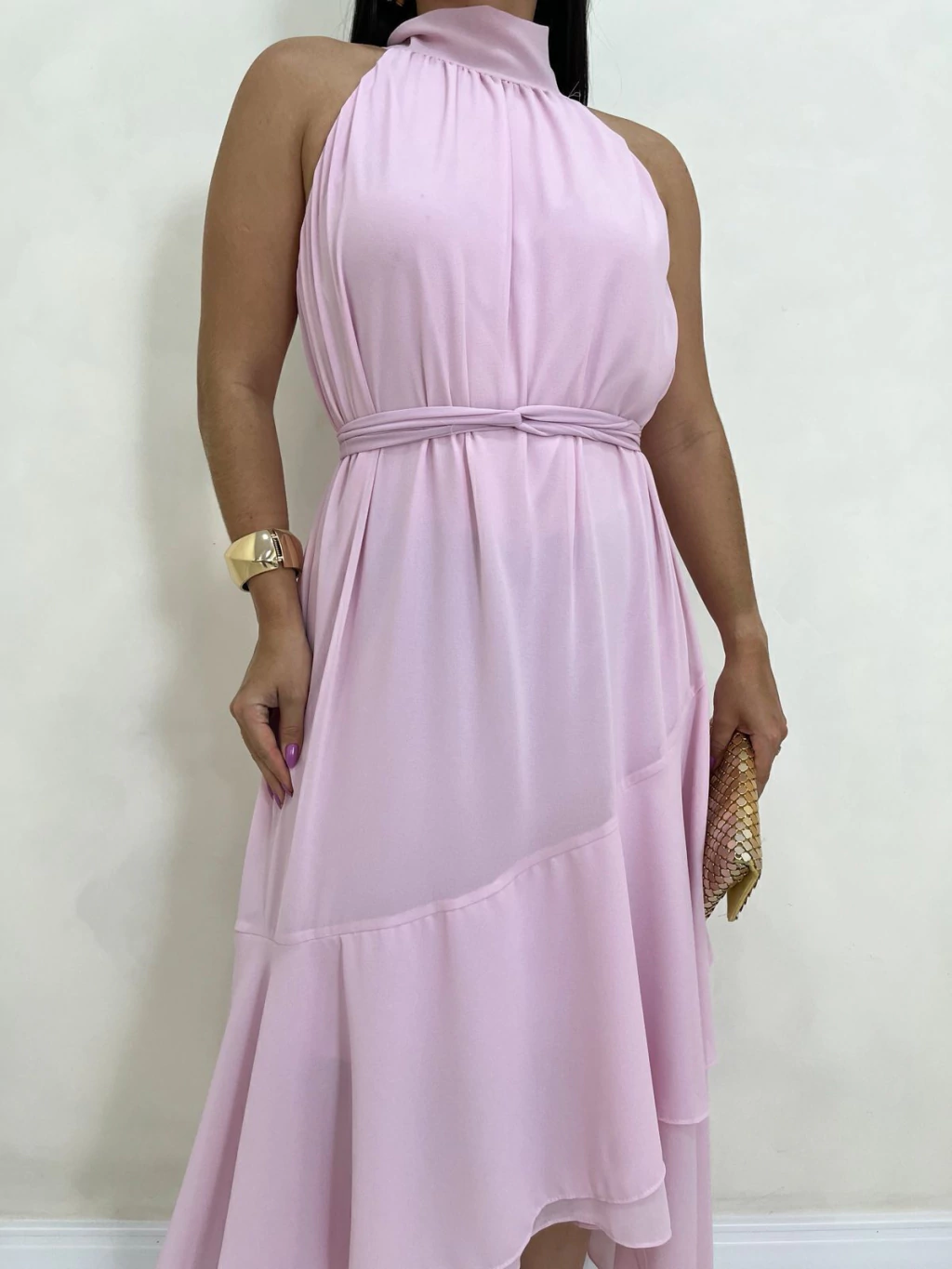 Vestido midi em chiffon. Possui fechado com gola alta e amarração no pescoço. Modelo sem mangas. Possui caimento solto ao corpo, com barra assimétrica e acompanha faixa para acinturar a peça. Tecido fluido, com forro. Não marca e não fica transparente.