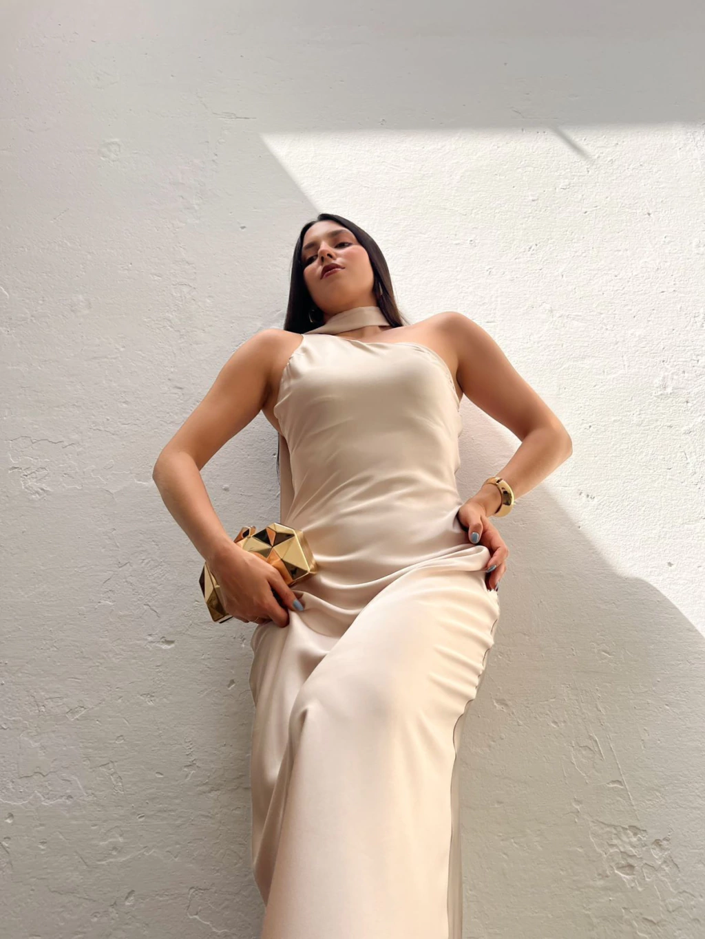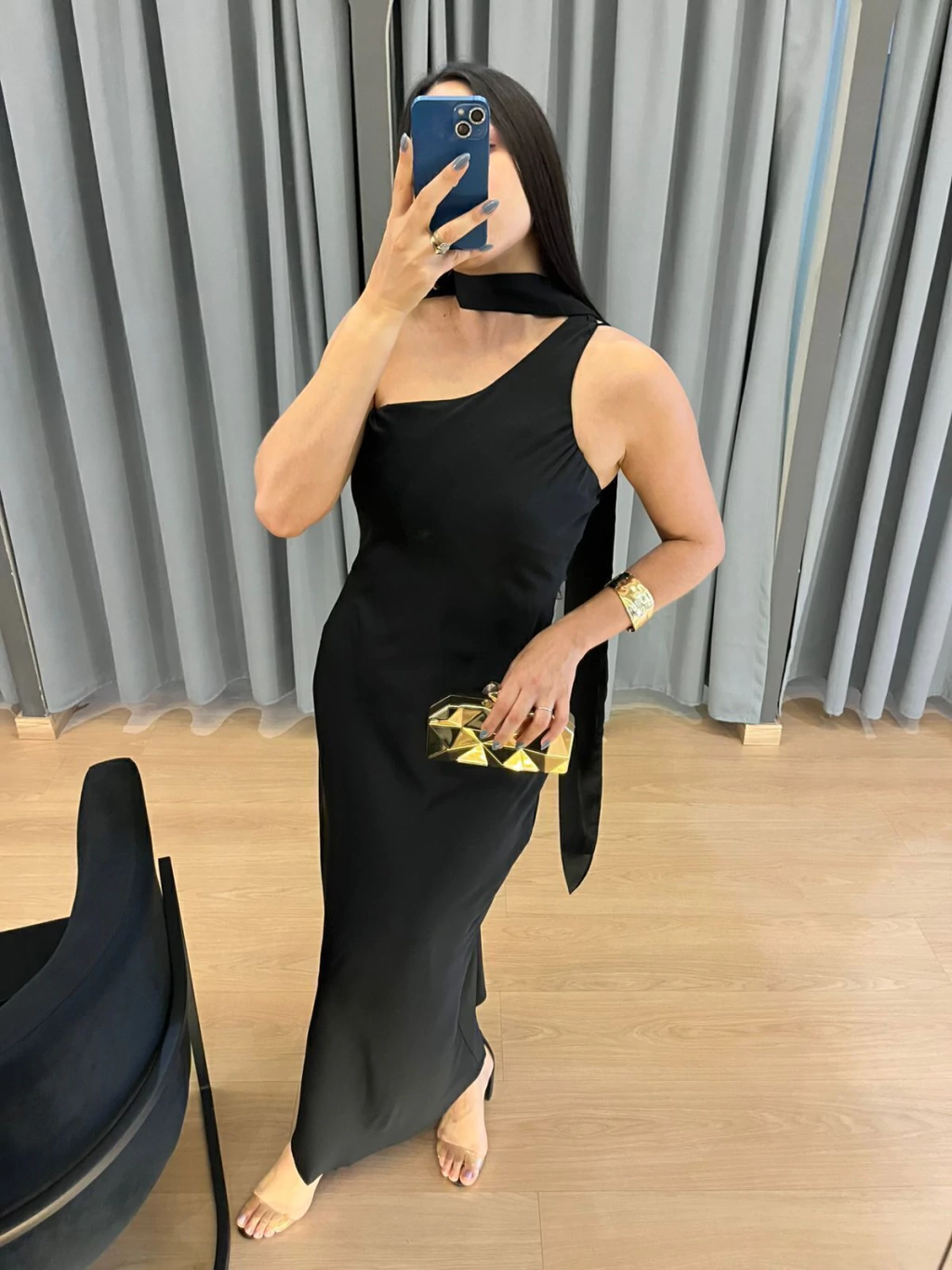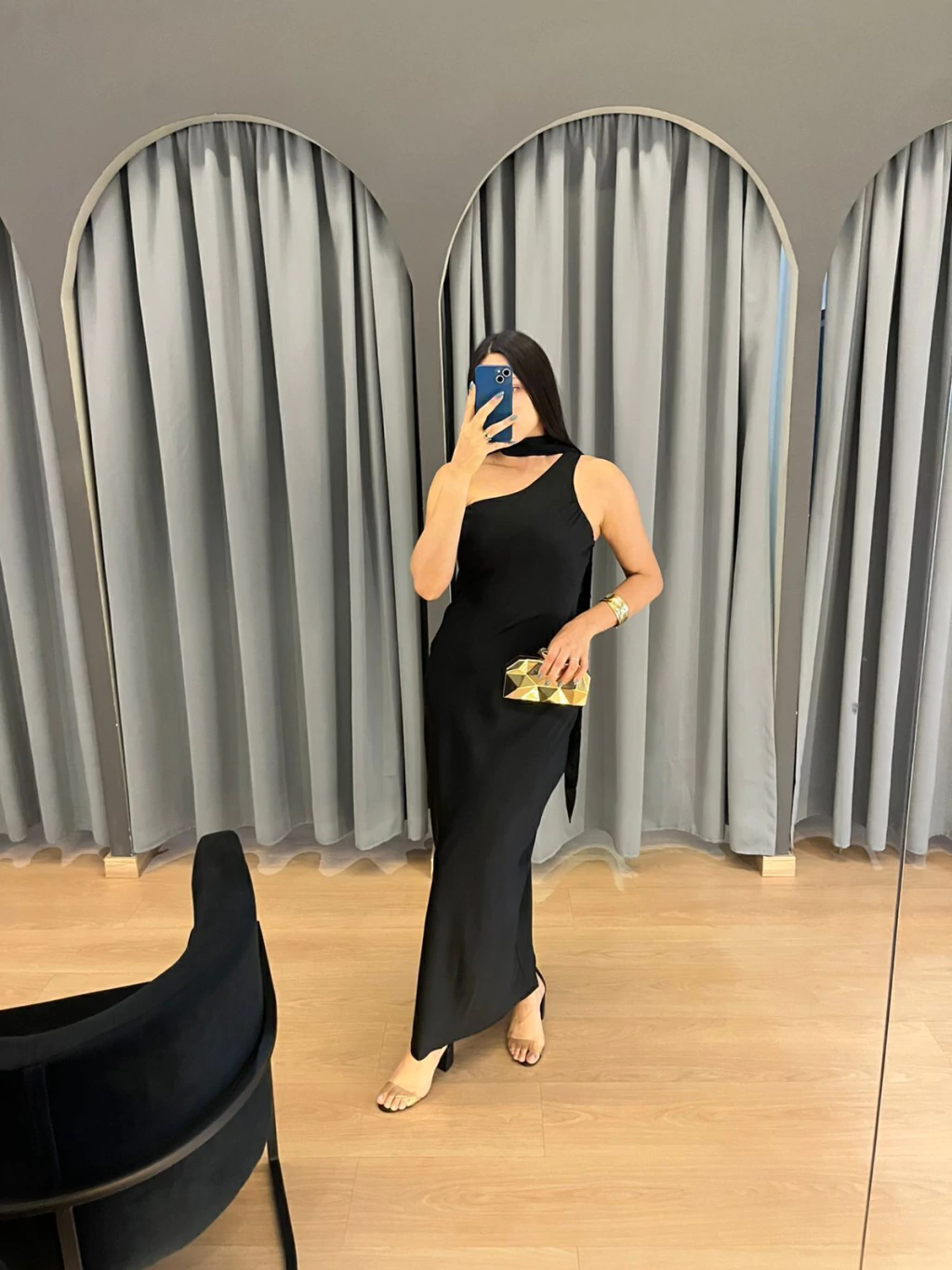 Vestido midi em cetim. Possui modelagem sleep dress. Possui decote de um ombro, com alça dupla. Possui regulagem nas alças e detalhe de faixa para passar em volta do pescoço. Modelo solto ao corpo. Não marca e não fica transparente.