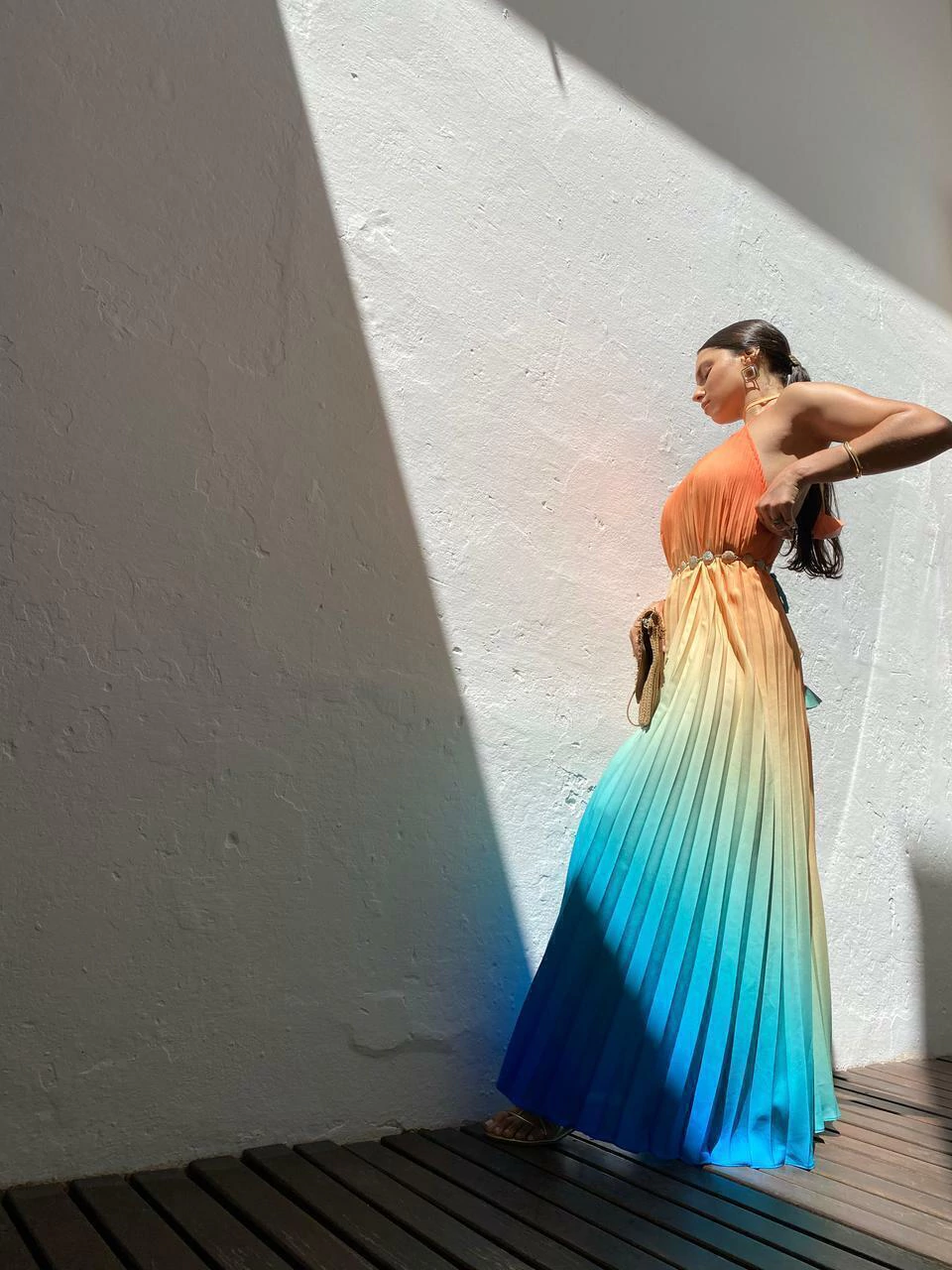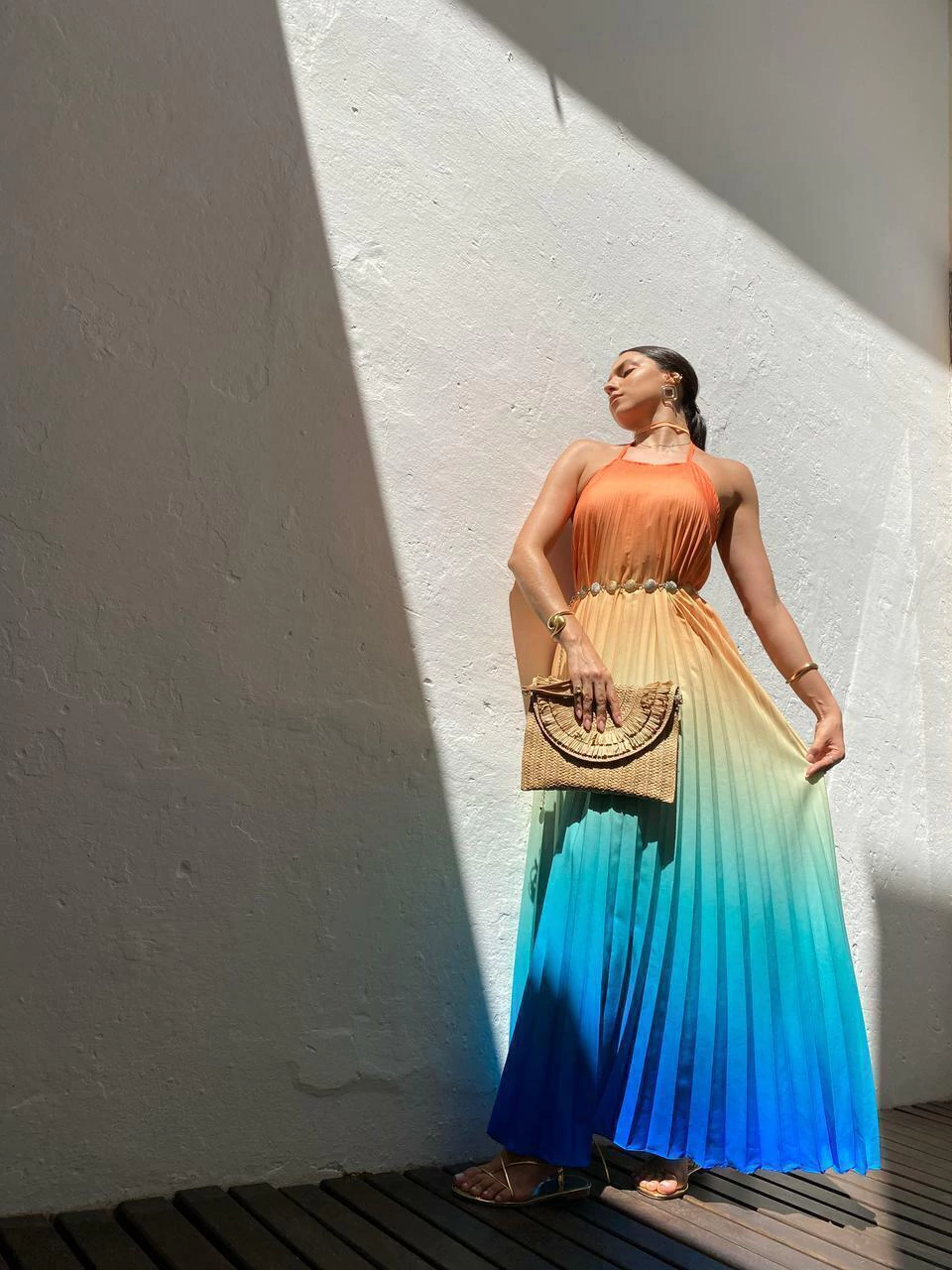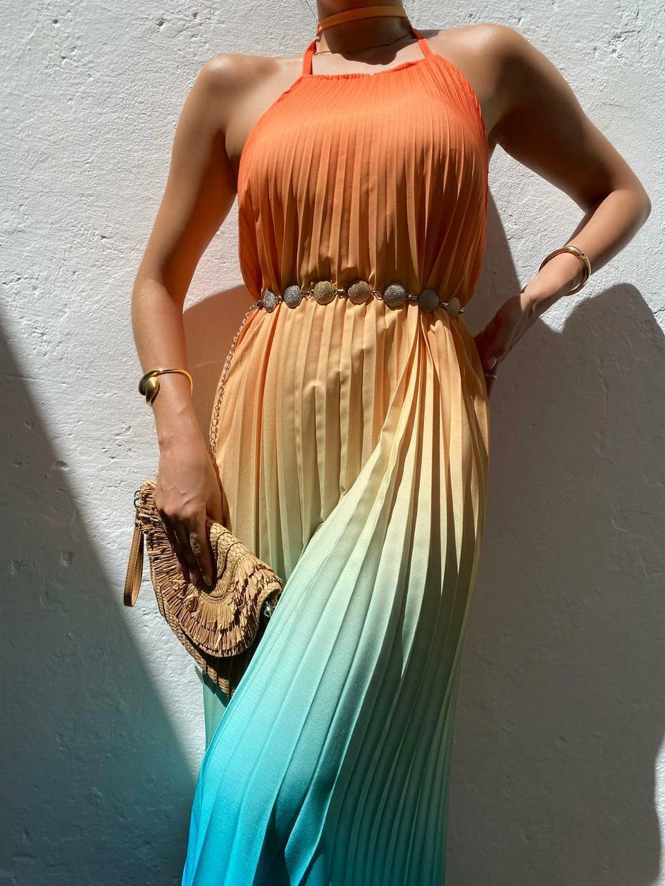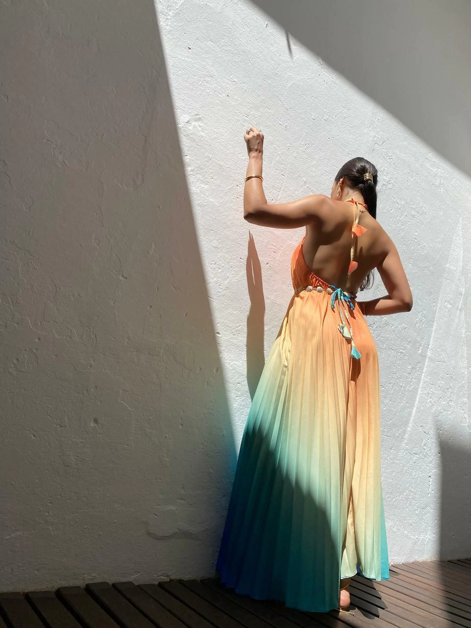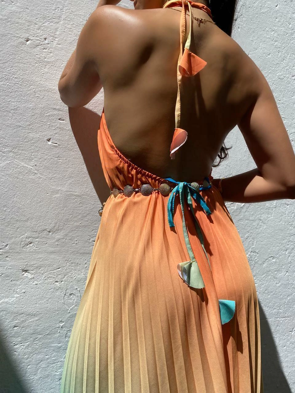 Vestido midi em tecido encorpado. Modelo todo plissado com combinação de cores estilo tie dye. Possui decote frente única com amarração no pescoço. Possui faixa para marcar a cintura ou amarrar apenas nas costas. Costas abertas, modelagem fluida, soltinha no corpo e possui bojo. Não marca e não fica transparente.