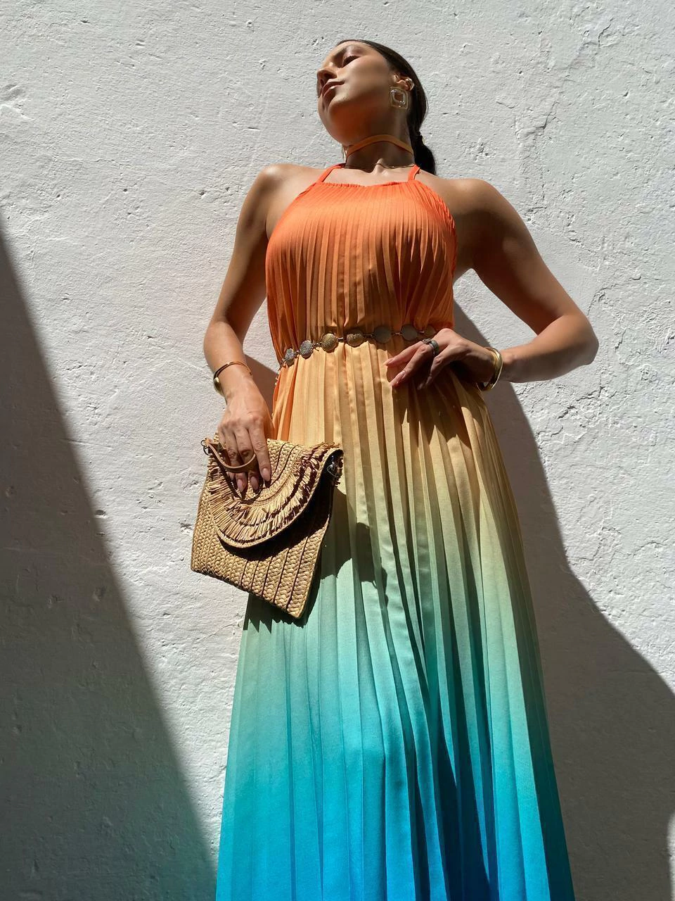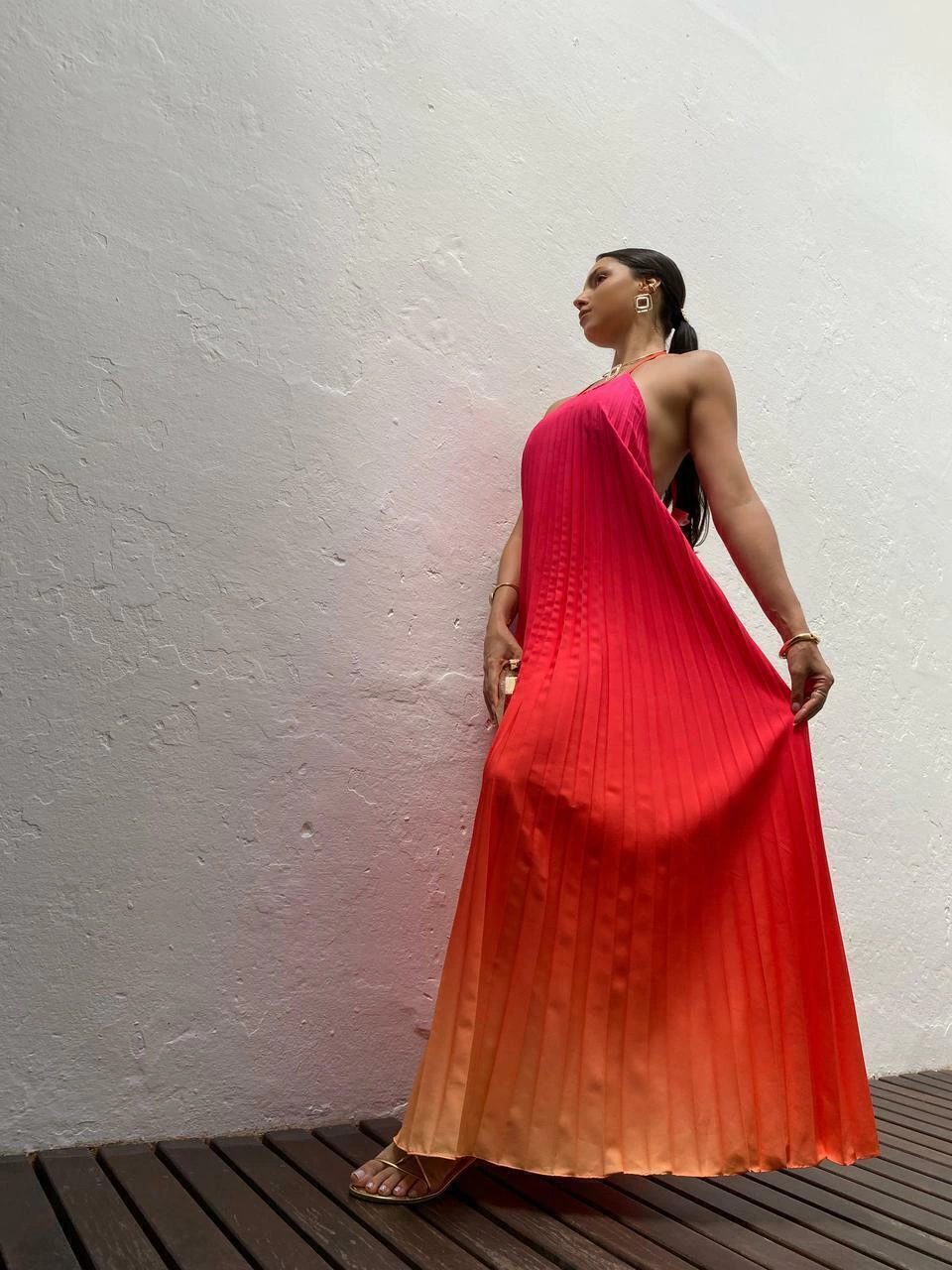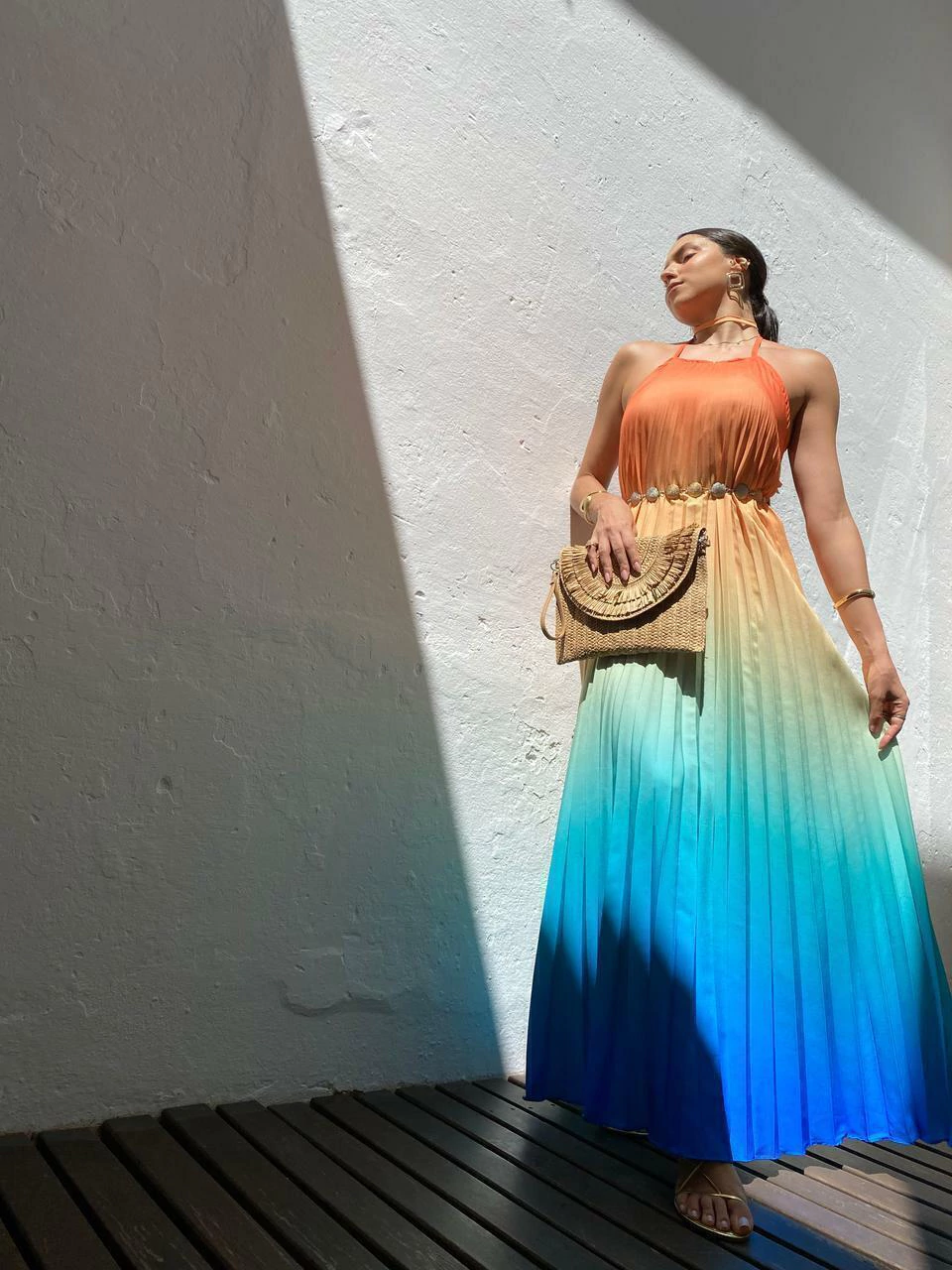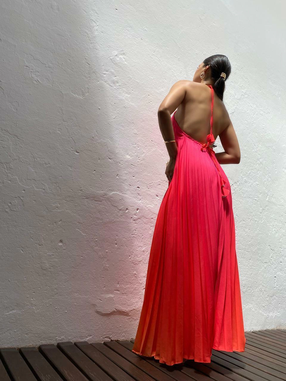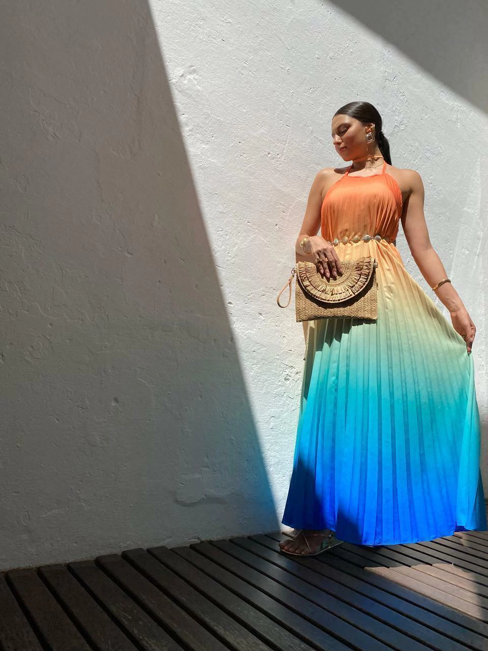 Vestido midi em tecido encorpado. Modelo todo plissado com combinação de cores estilo tie dye. Possui decote frente única com amarração no pescoço. Possui faixa para marcar a cintura ou amarrar apenas nas costas. Costas abertas, modelagem fluida, soltinha no corpo e possui bojo. Não marca e não fica transparente.