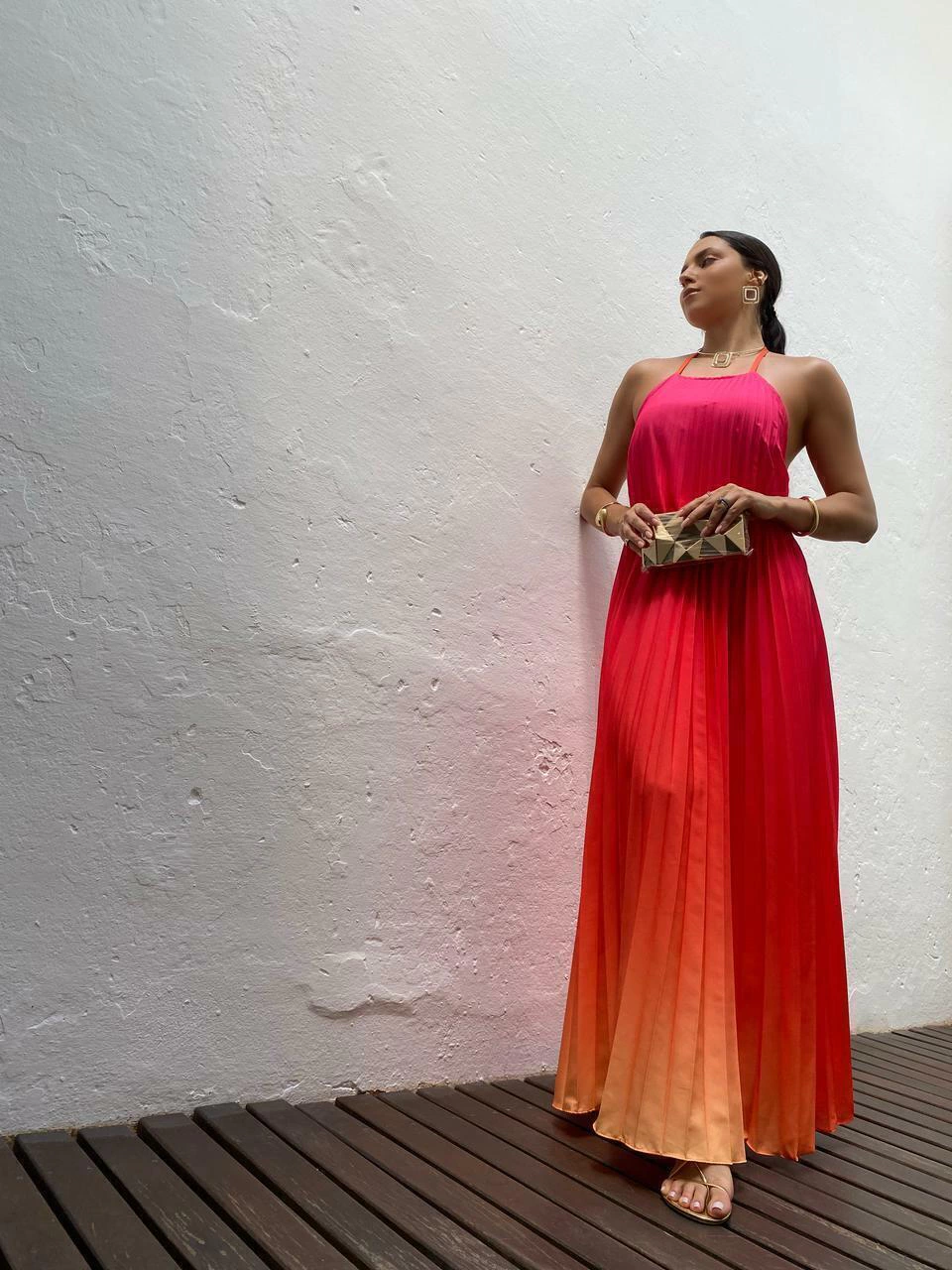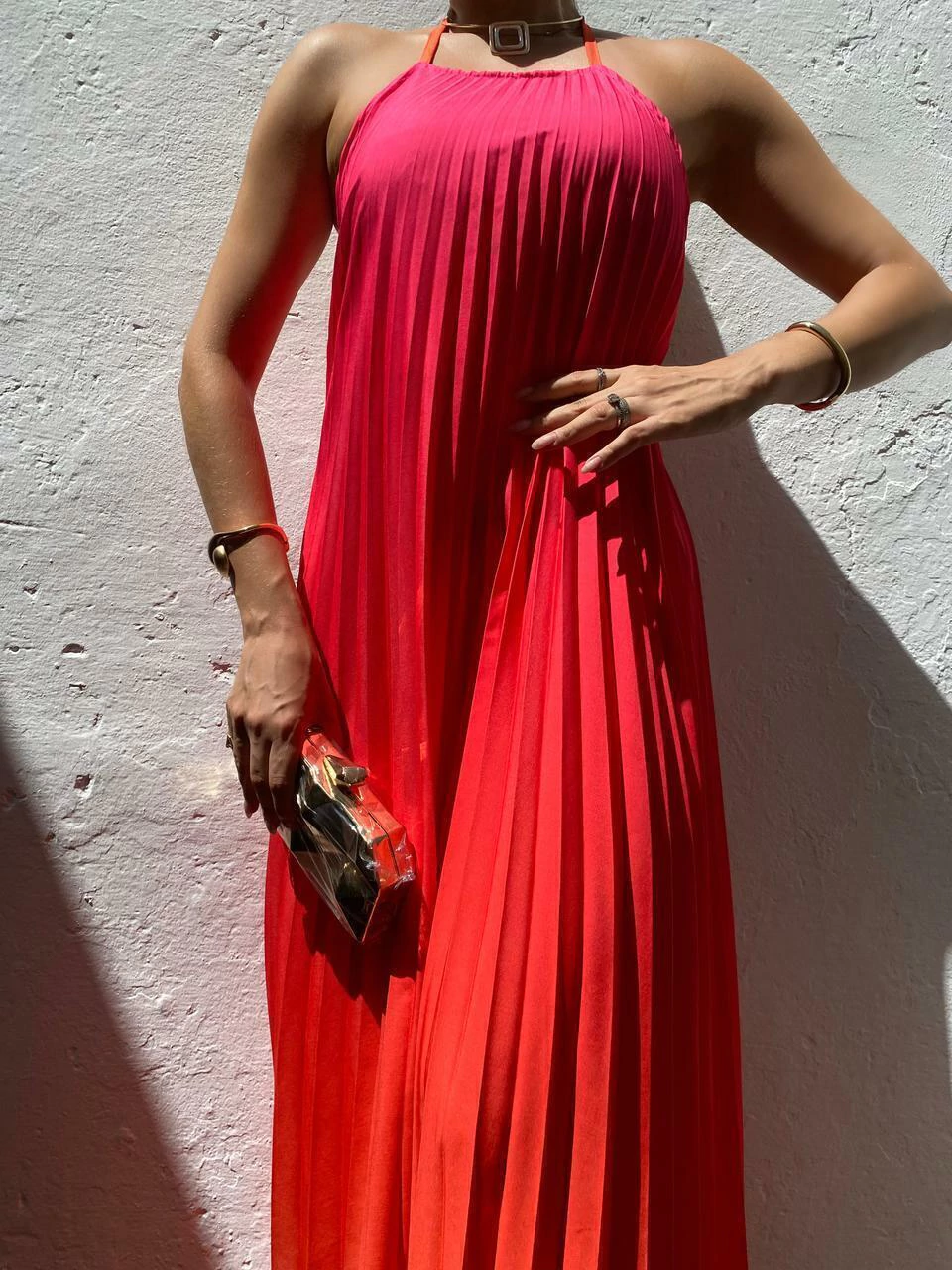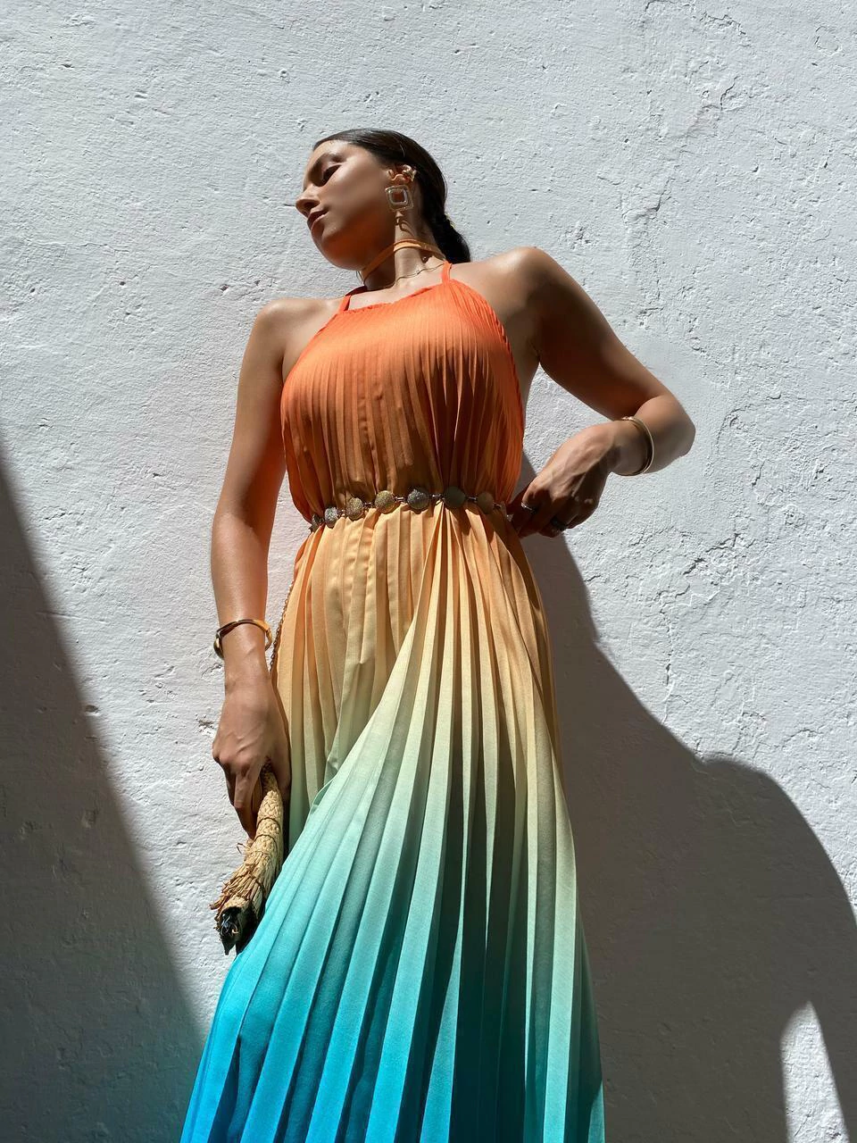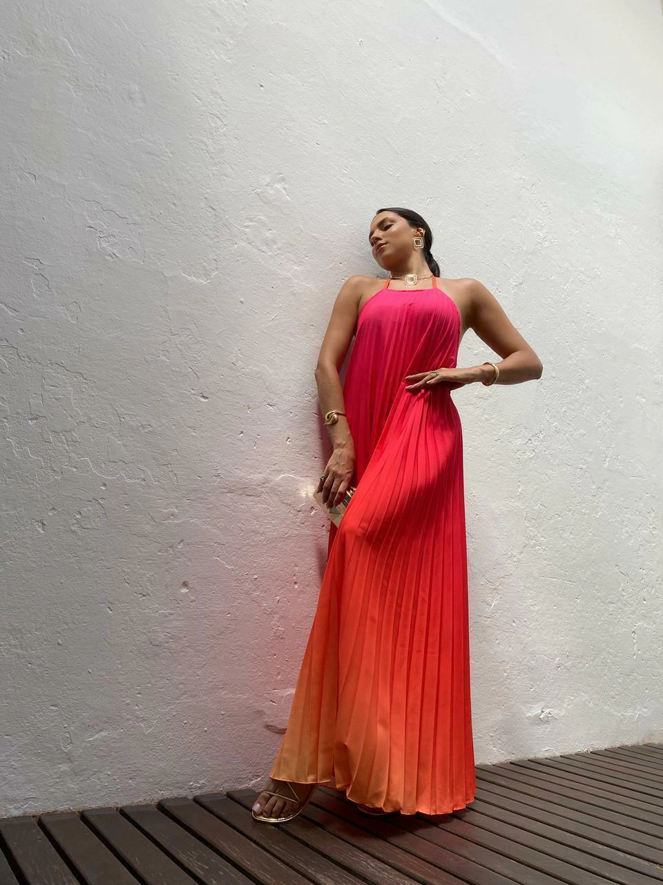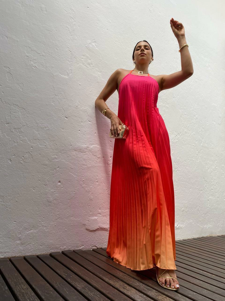 Vestido midi em tecido encorpado. Modelo todo plissado com combinação de cores estilo tie dye. Possui decote frente única com amarração no pescoço. Possui faixa para marcar a cintura ou amarrar apenas nas costas. Costas abertas, modelagem fluida, soltinha no corpo e possui bojo. Não marca e não fica transparente.
