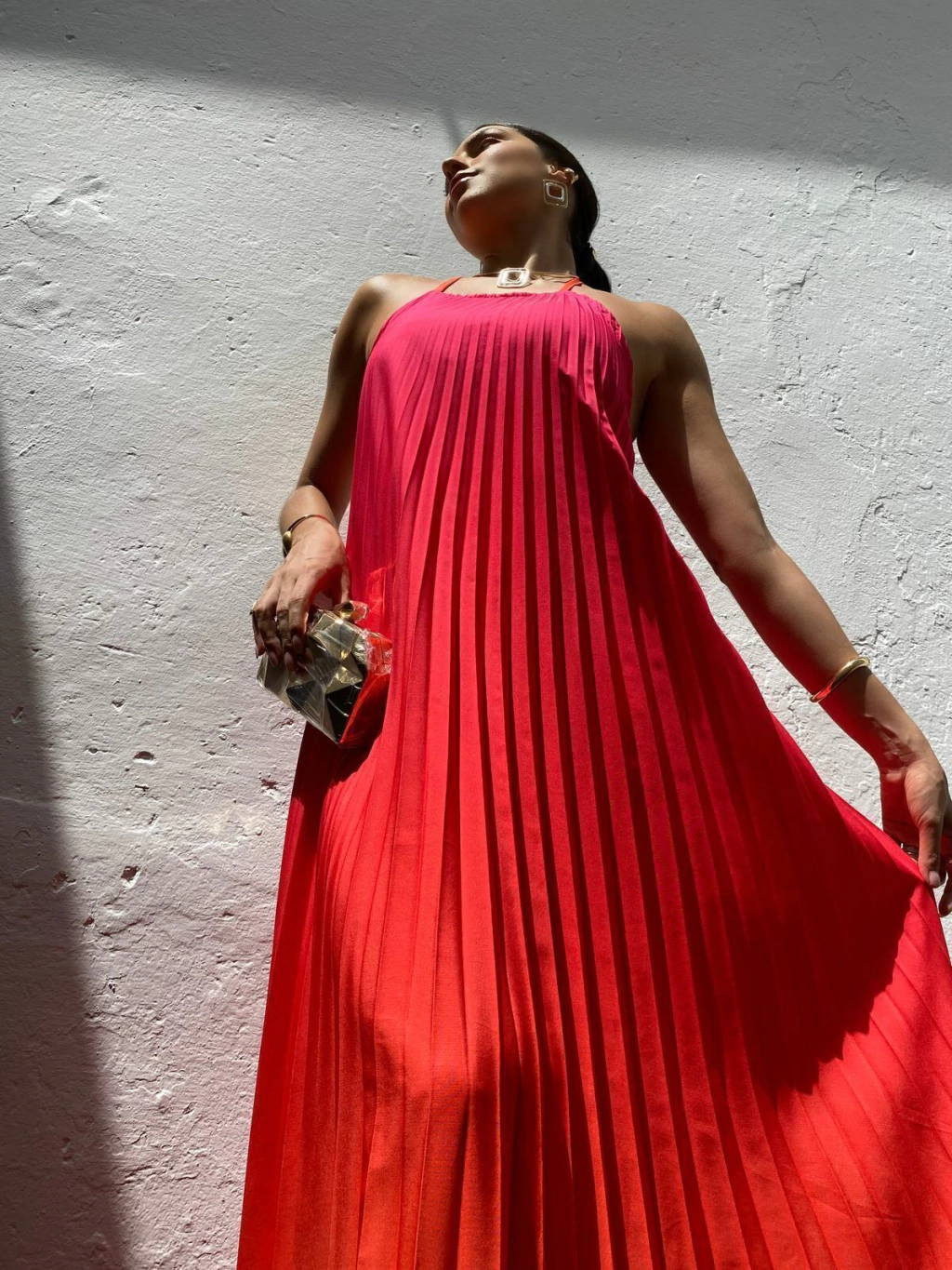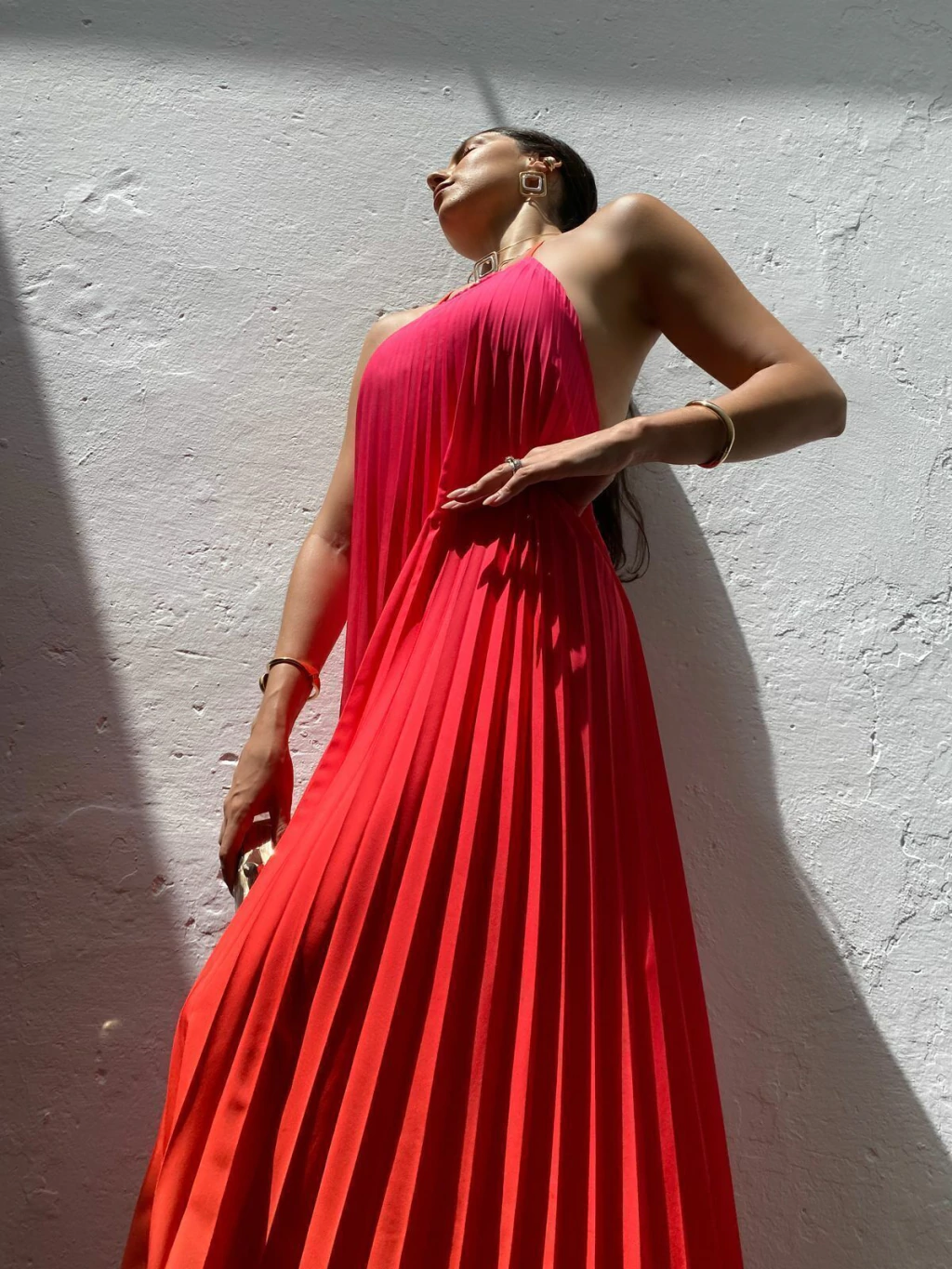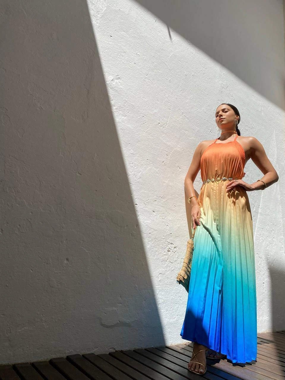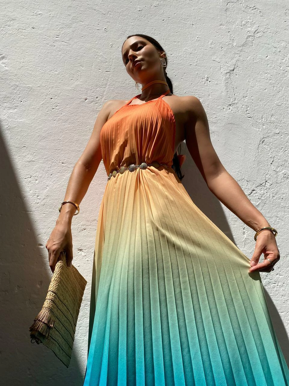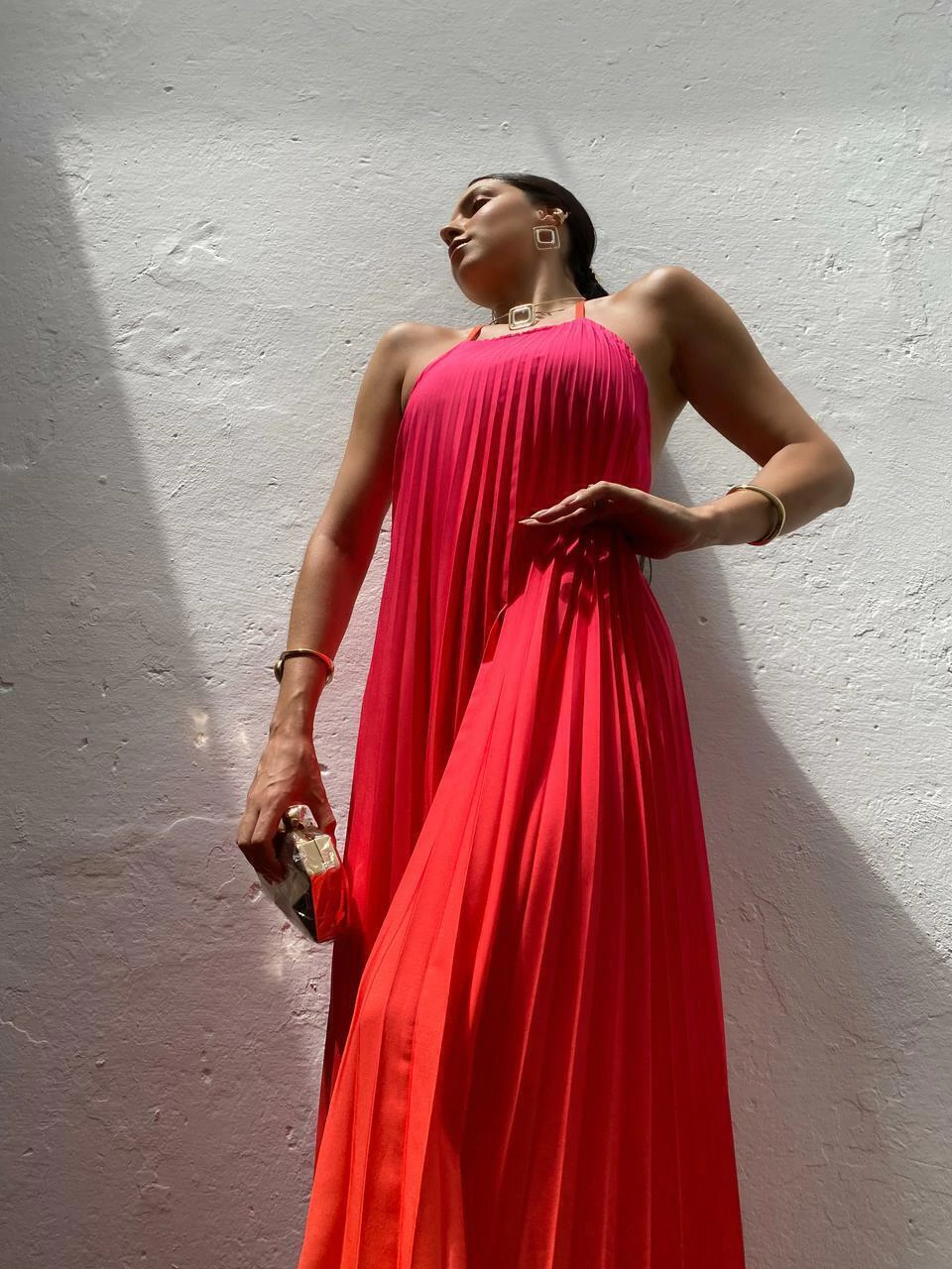 Vestido midi em tecido encorpado. Modelo todo plissado com combinação de cores estilo tie dye. Possui decote frente única com amarração no pescoço. Possui faixa para marcar a cintura ou amarrar apenas nas costas. Costas abertas, modelagem fluida, soltinha no corpo e possui bojo. Não marca e não fica transparente.