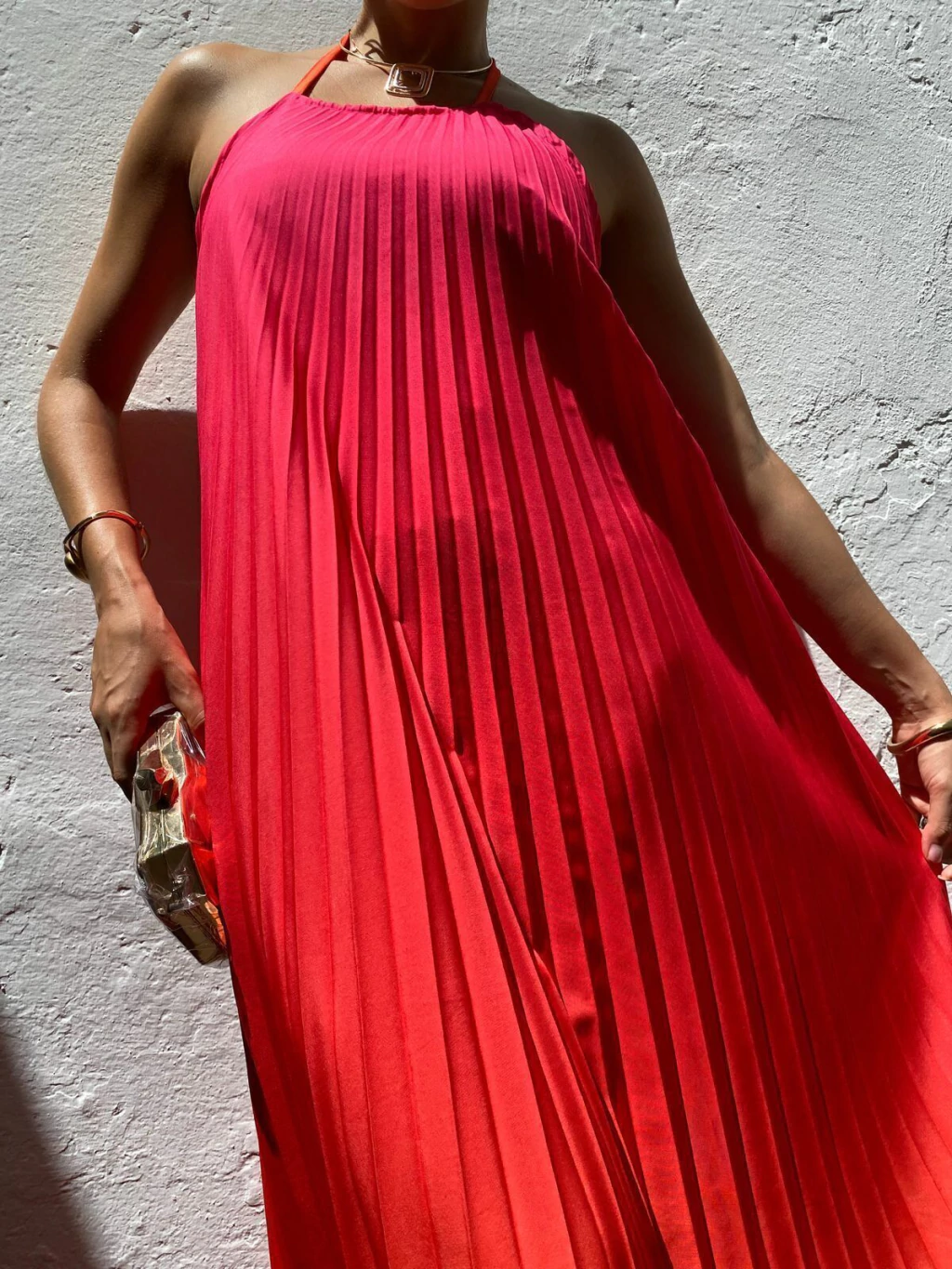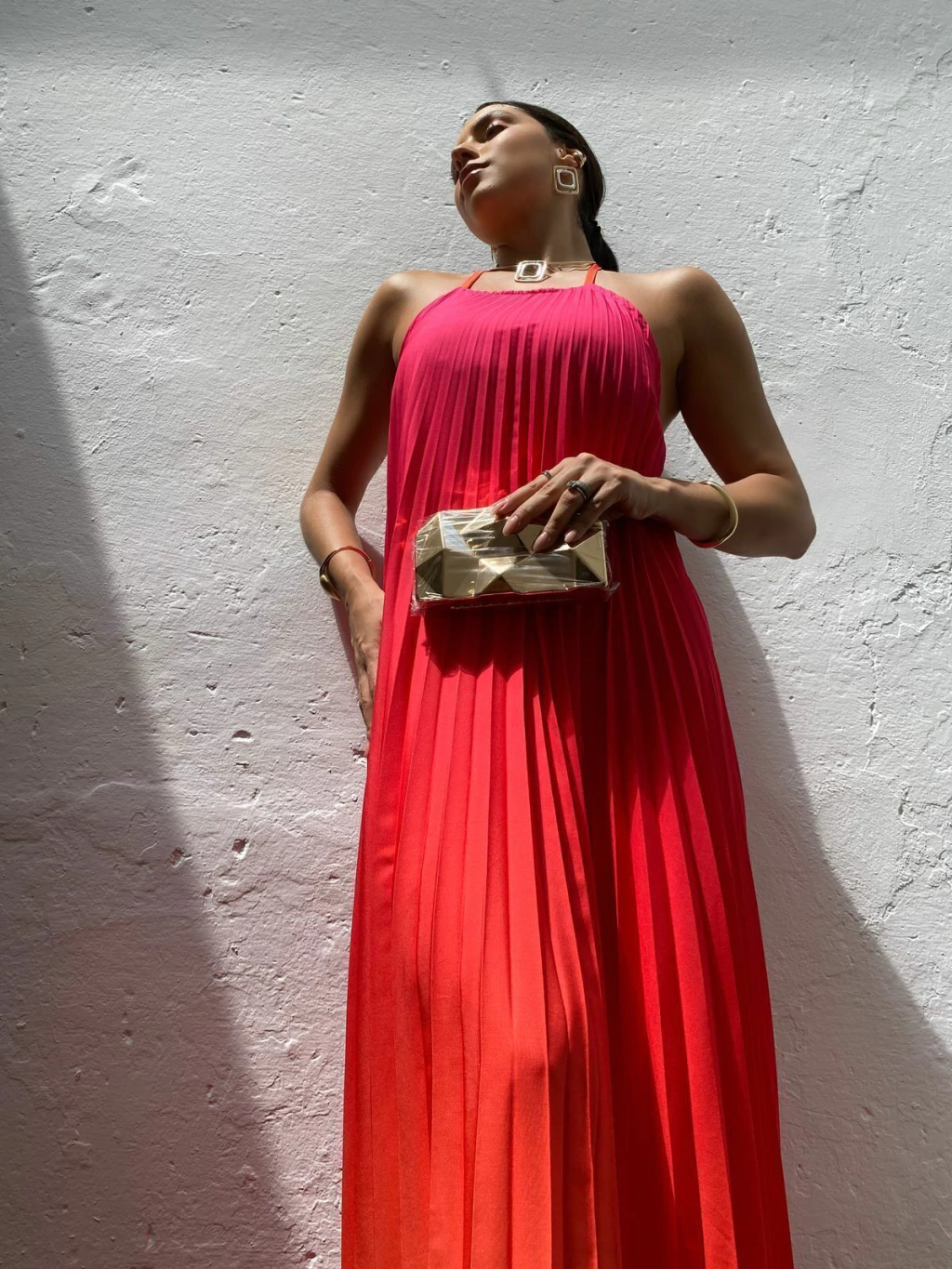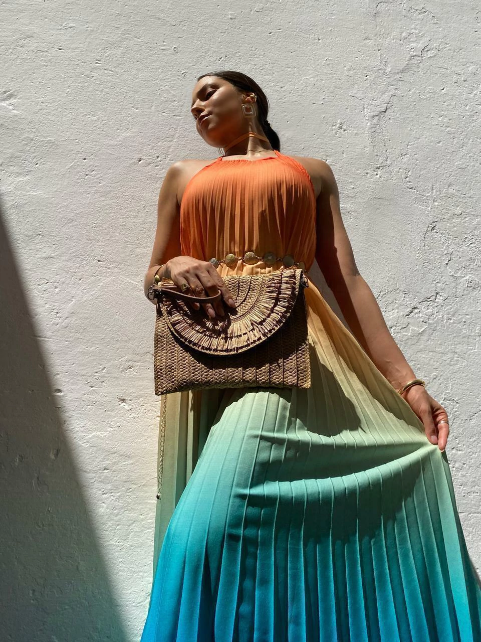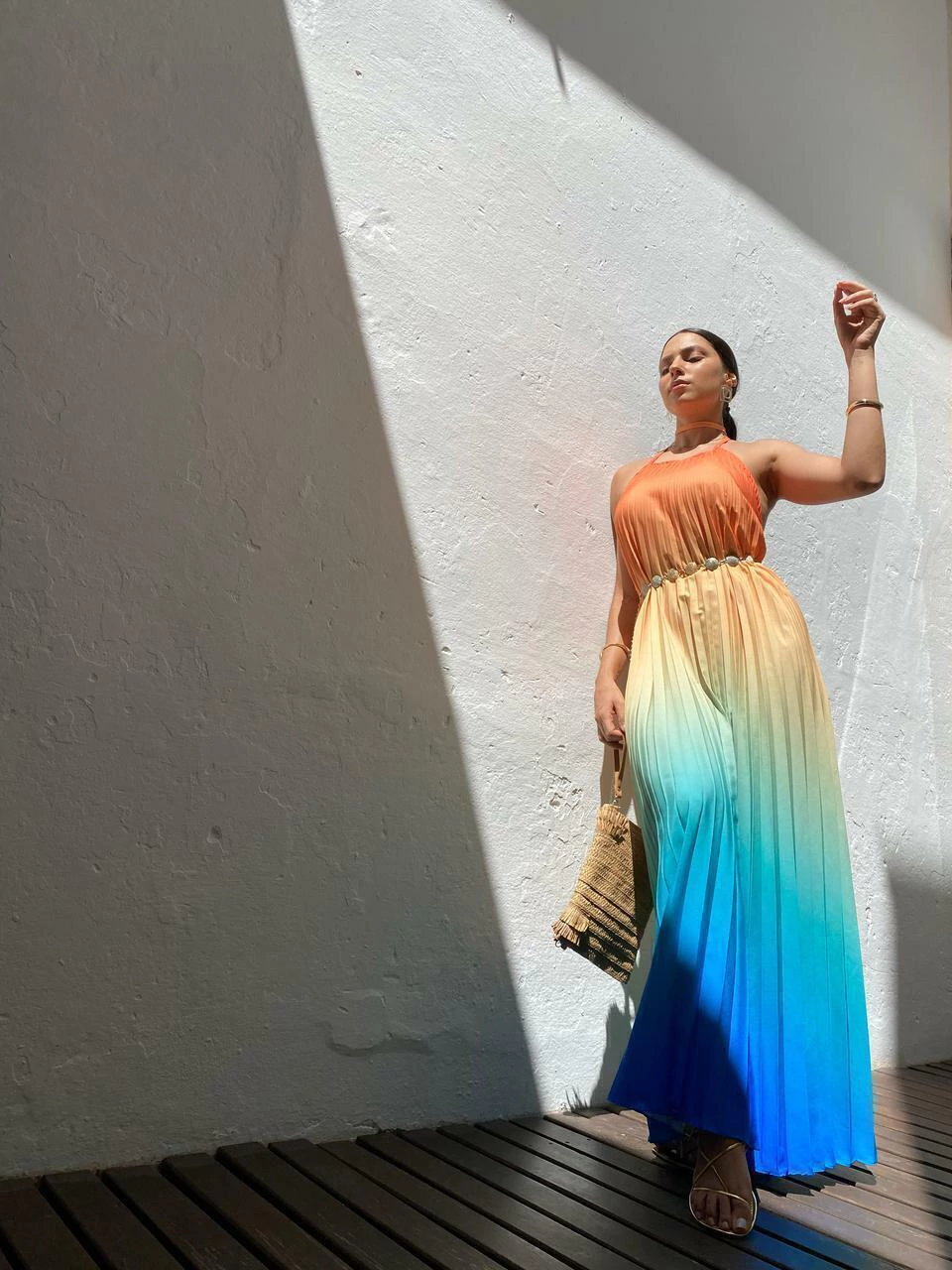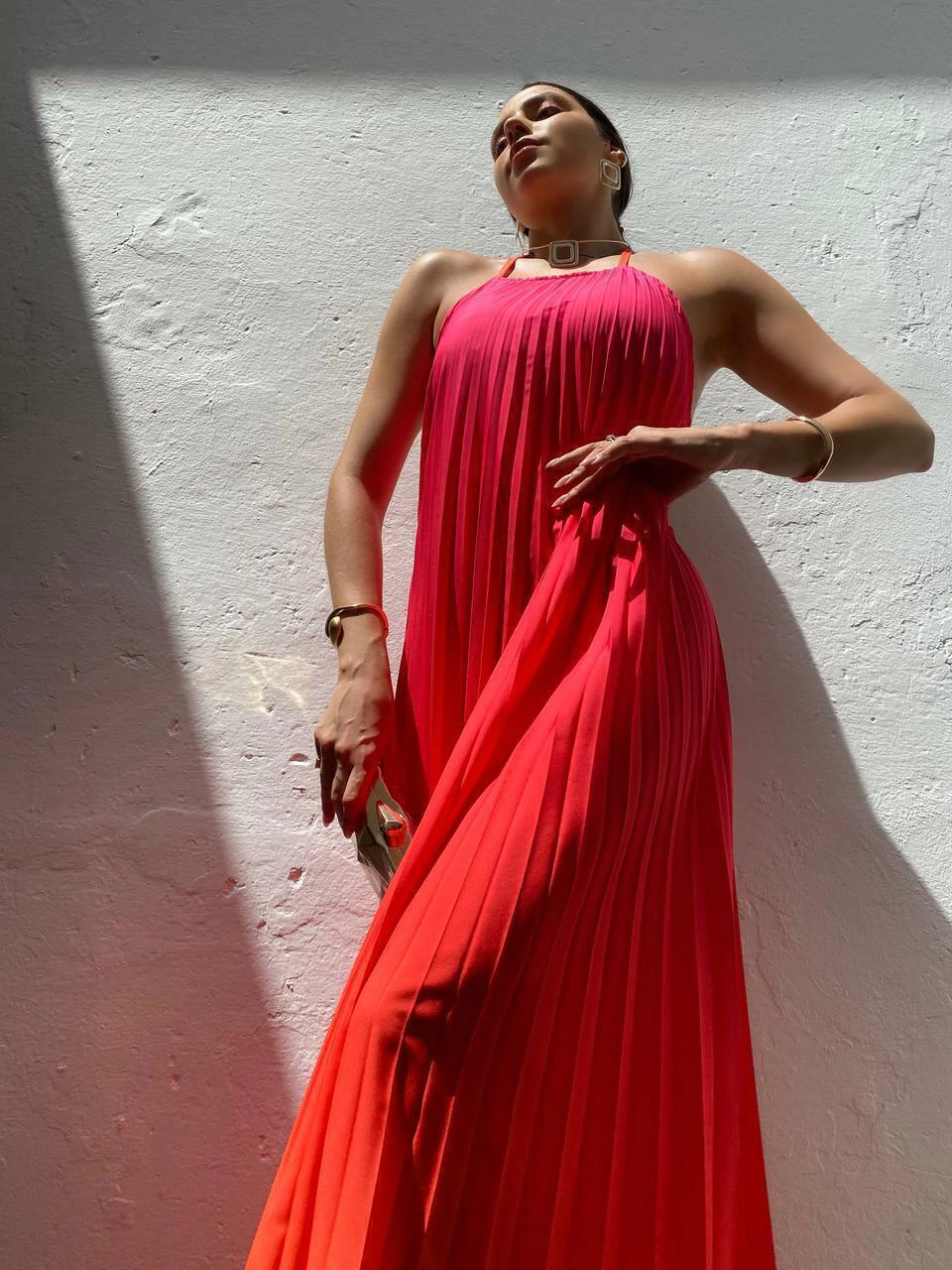 Vestido midi em tecido encorpado. Modelo todo plissado com combinação de cores estilo tie dye. Possui decote frente única com amarração no pescoço. Possui faixa para marcar a cintura ou amarrar apenas nas costas. Costas abertas, modelagem fluida, soltinha no corpo e possui bojo. Não marca e não fica transparente.